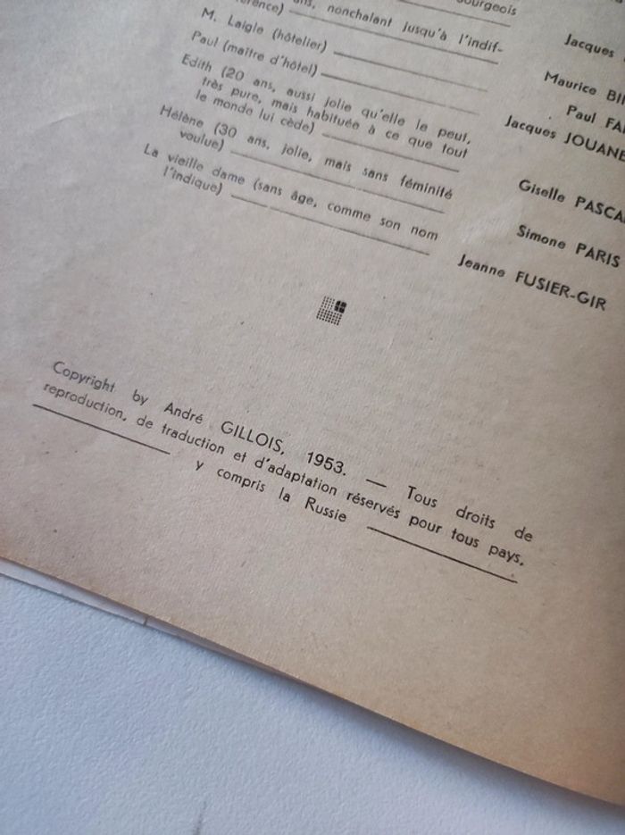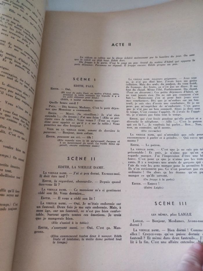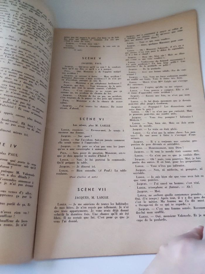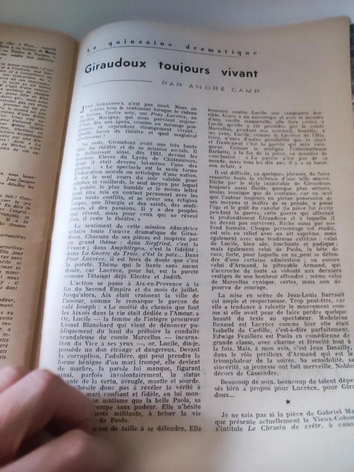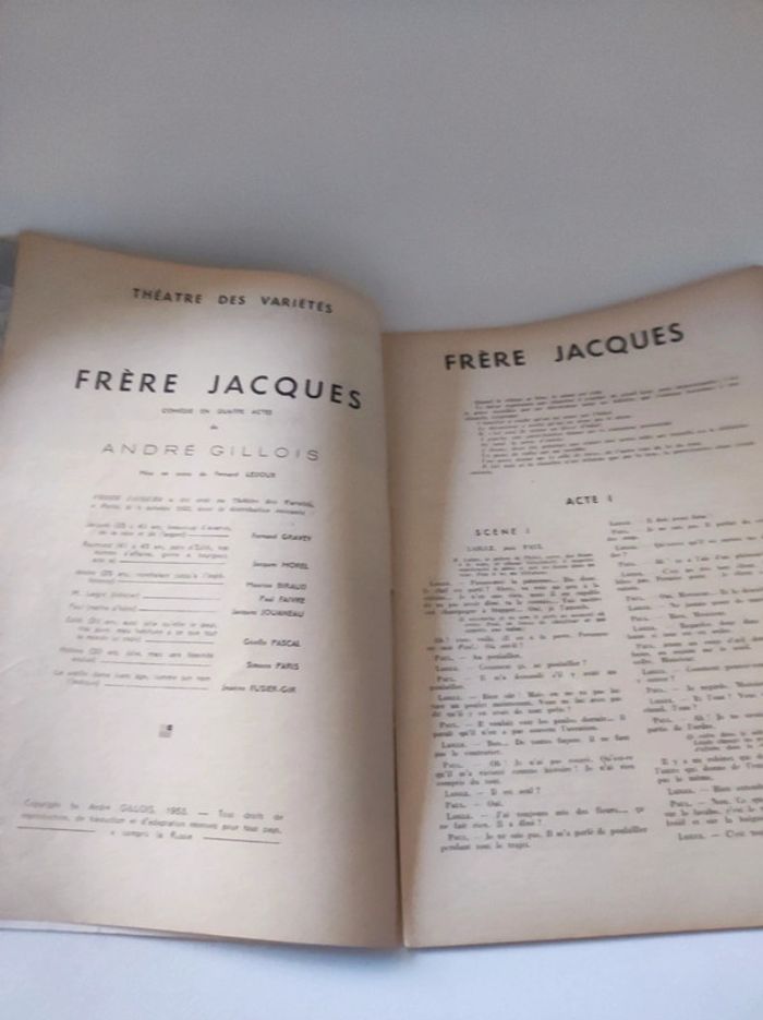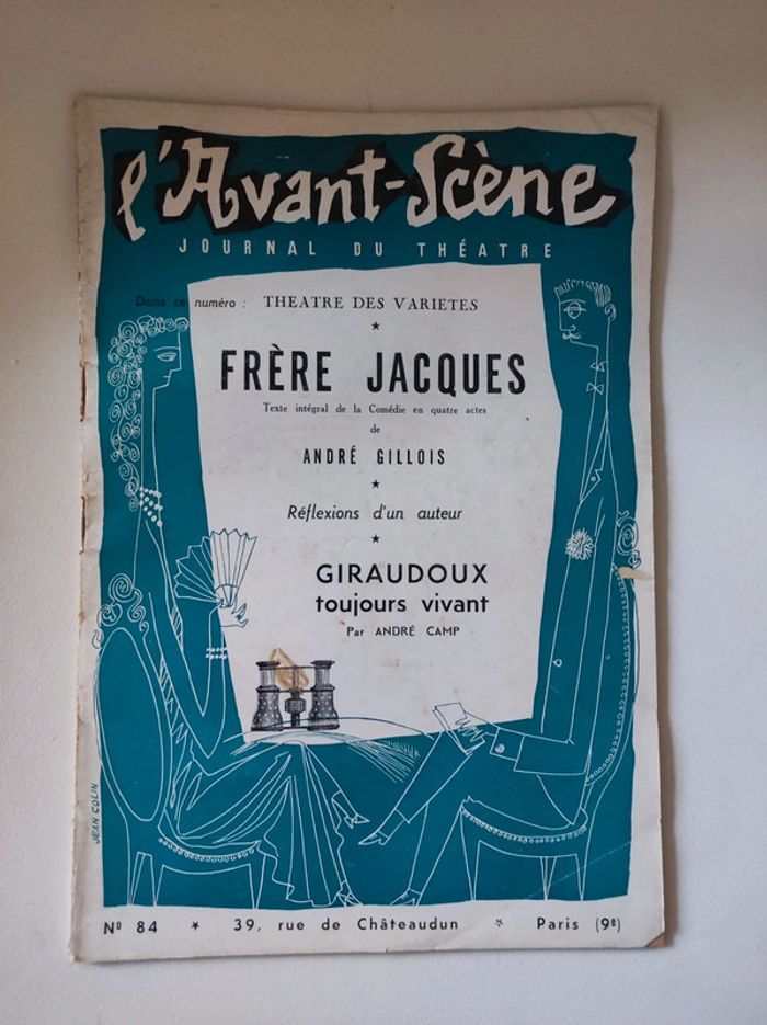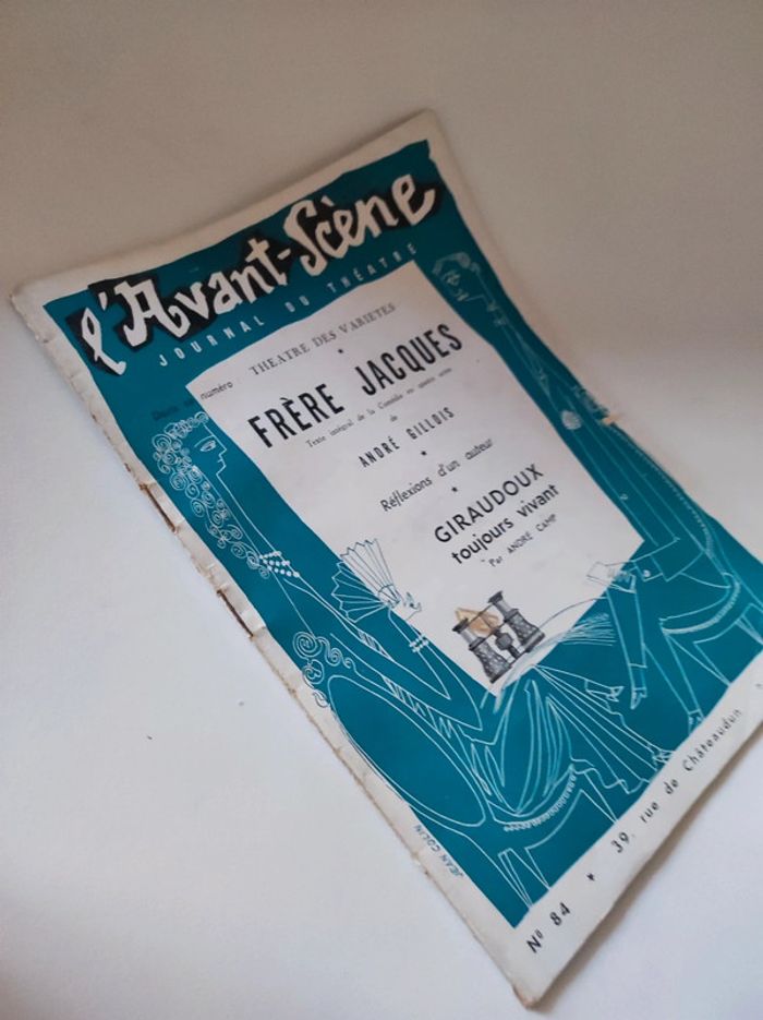 Revue / journal du theatre ancienne / vintage L'avant scène n°84 de 1953 Frères Jacques de André Gillois - théâtre de variétés Format 26,5 x 18 cm. / 40 pages. Sortie par le bureau de la revue. Une revue comportant des pièces de théâtre intégrales avec les détails des mises en scènes, des textes sur les acteurs , les coulisses, les metteurs en scènes, des articles, Des photos en noir et blanc d'acteurs (madeleine Renaud, Gisèle Pascale...), des critiques, et une mise en avant des sorties théâtre de l'époque. Sommaire : - Frères Jacques , texte intégral de la Comédie en 4 actes de André Gillois. - Réflexion d un auteur - Giraudoux toujours vivant par André camp. Très bon état ! Interieur impeccable. Imperfections : pages jaunies par le temps. quelques marques sur la couverture, corne sur première de couverture en bas. Couverture verte et blanche avec une illustration de Jean Colin. Ne pas faire attention à la référence ISBN. Le livre est trop âge pour avoir un ISBN.