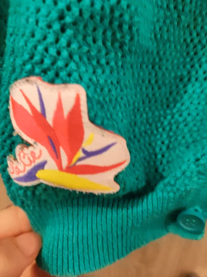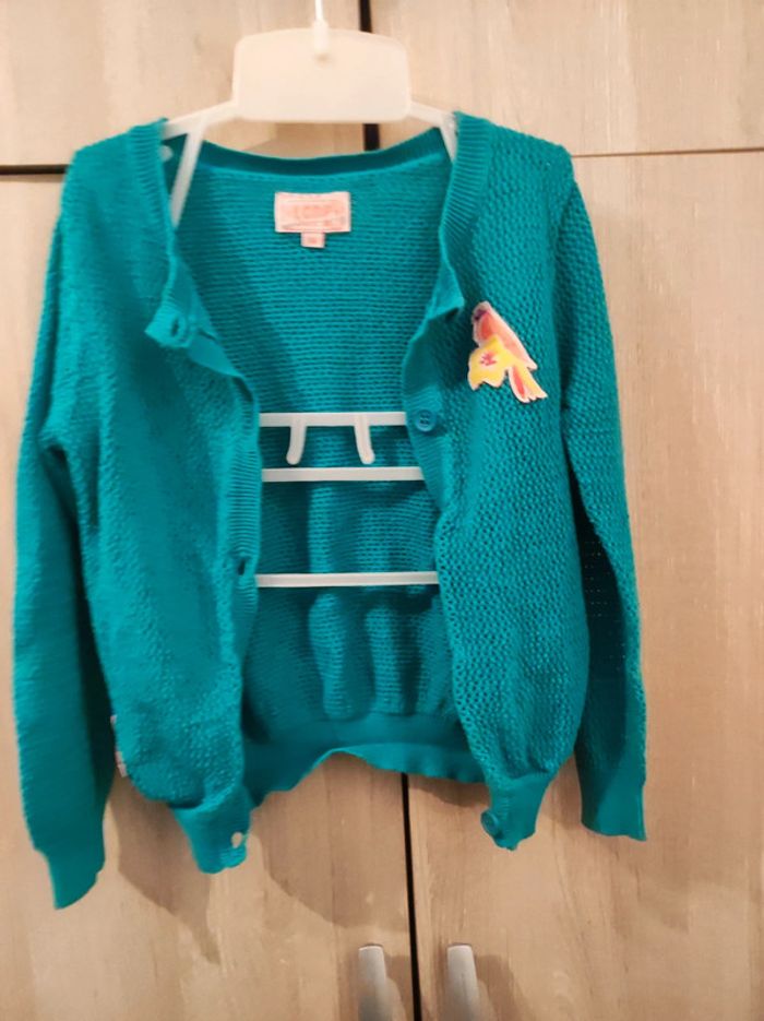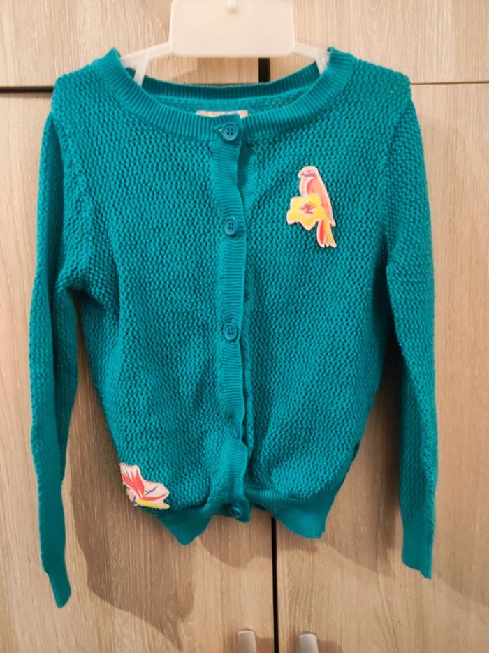 Gilet type cardigan a boutonnières Marque lcdp / La compagnie des petits Taille 3 ans Couleurs bleu canard. Style maille 100 % coton. Avec pièces style écusson d'un oiseau exotique multicolore. Manches longues Parfait état. Comme neuf. #jemholofille3ans