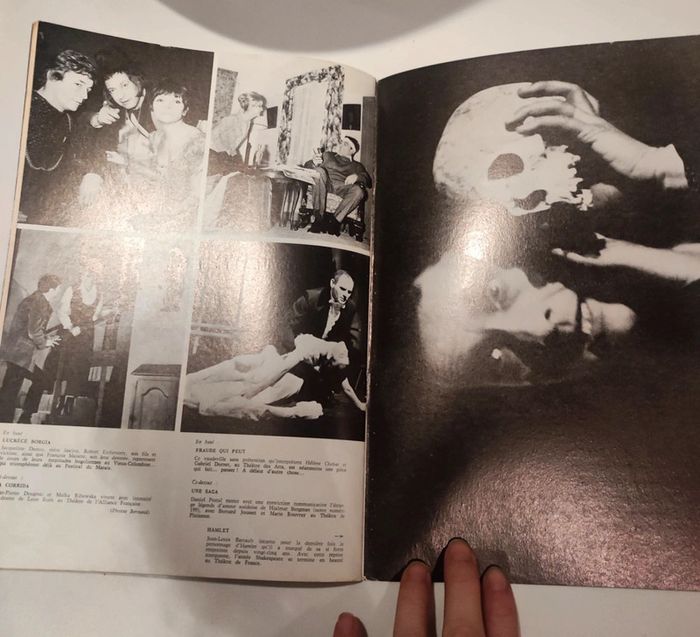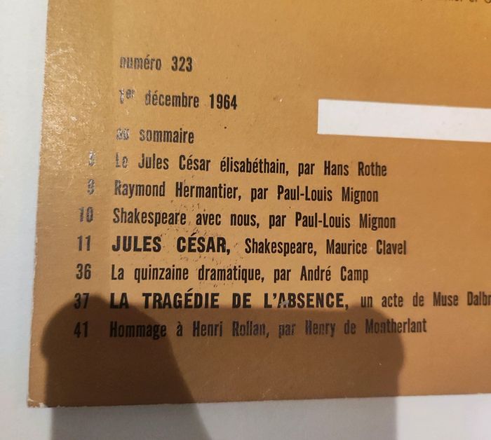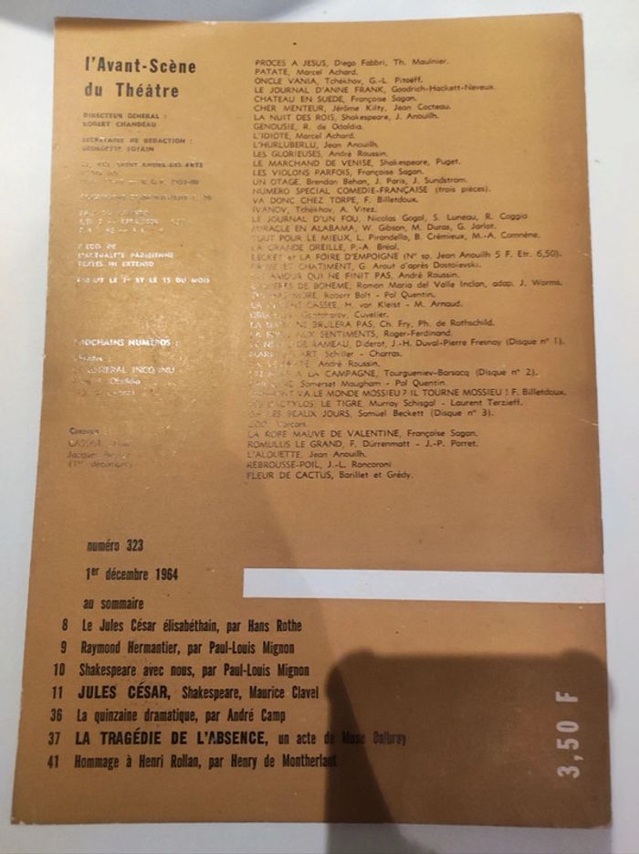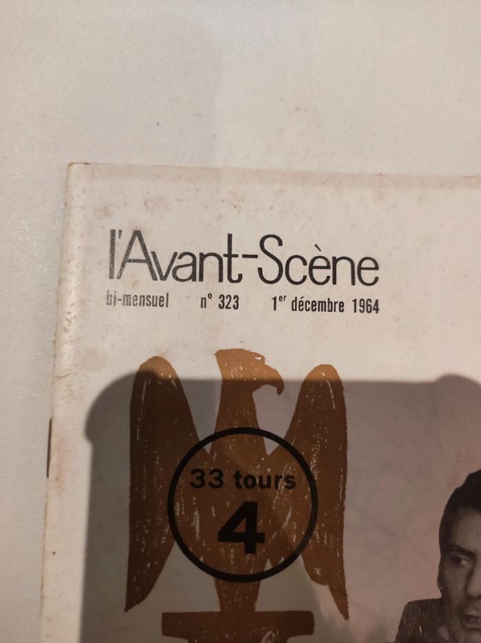 Revue / journal de theatre ancienne L'avant scène n°323 du 1er décembre 1964 Jules César Format 26,5 x 18 cm. / 50 pages. Sortie par le bureau de la revue. Une revue comportant des pièces de théâtre intégrales avec les détails des mises en scènes, des textes sur les acteurs , les coulisses, les metteurs en scènes, des articles, Des photos en noir et blanc d'acteurs (André reybaz, Elia Clermont, Jacques dacqumine, malka ribowska...), des critiques, et une mise en avant des sorties théâtre de l'époque. Sommaire : - Le Jules César élisabéthain, par Hans Rothe - Raymond Hermantier, par Jean Louis Mignon - Shakespeare, avec nous par Paul-Louis Mignon - Jules César, Shakespeare, Maurice Clavel ( pièce integrale ) - la quinzaine dramatique, par André camp - la tragédie de l'absence, un acte de mise dalbrzy - hommage a Henri Rollan, par Henry de Montherlant. Très bon état ! Interieur impeccable. Imperfections : quelques marques sur la couverture Couverture blanche et dorée . . Trop ancien pour avoir un ISBN / la référence indiquée n'est donc pas bonne dans l'application.