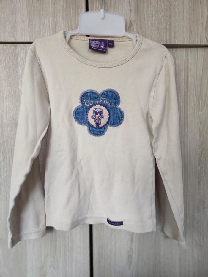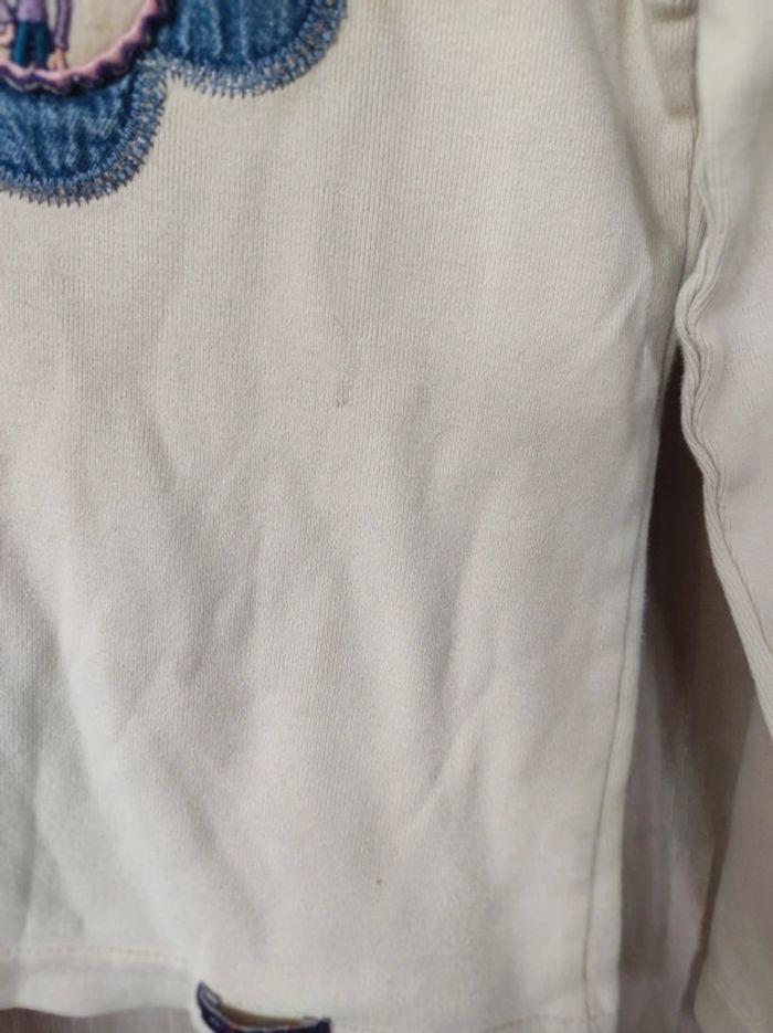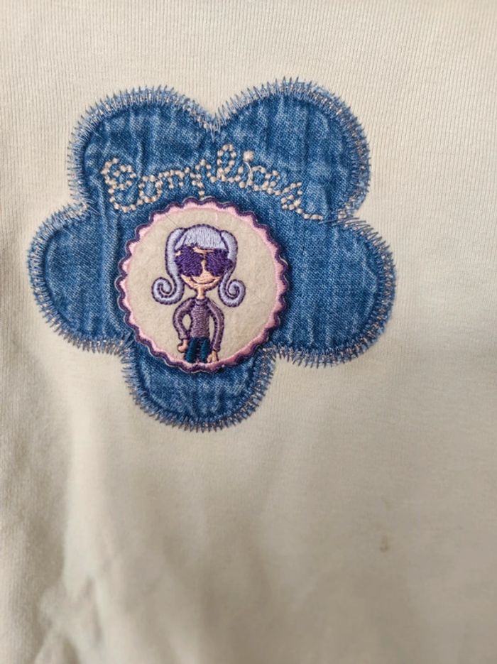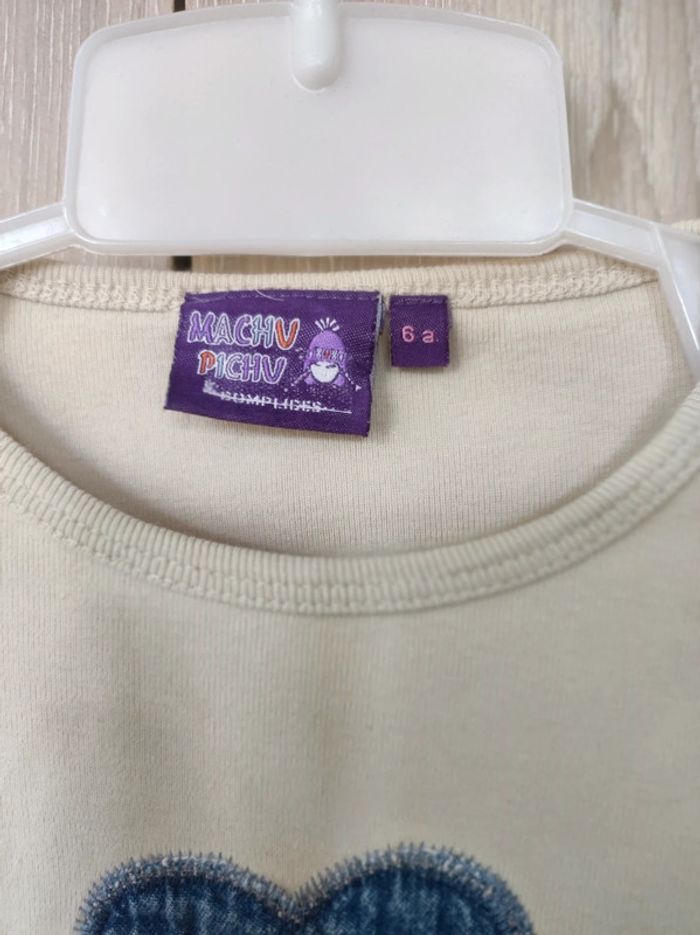 Sweat / pull fin manches longues Marque complices modèle Machu Pichu Taille 6 ans Couleurs beige crème. Motif cousu et écusson / empiècement jean a l'avant représentant une petite fille aux cheveux violets dans une fleur. Col rond manches longues. Parfait état (une minuscule tâche a l'avant - voir dernière photo ). Etiquette matière effacée. Je vends le même en bleu. #jemholofille6ans
