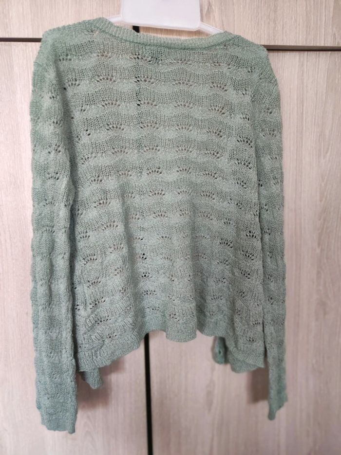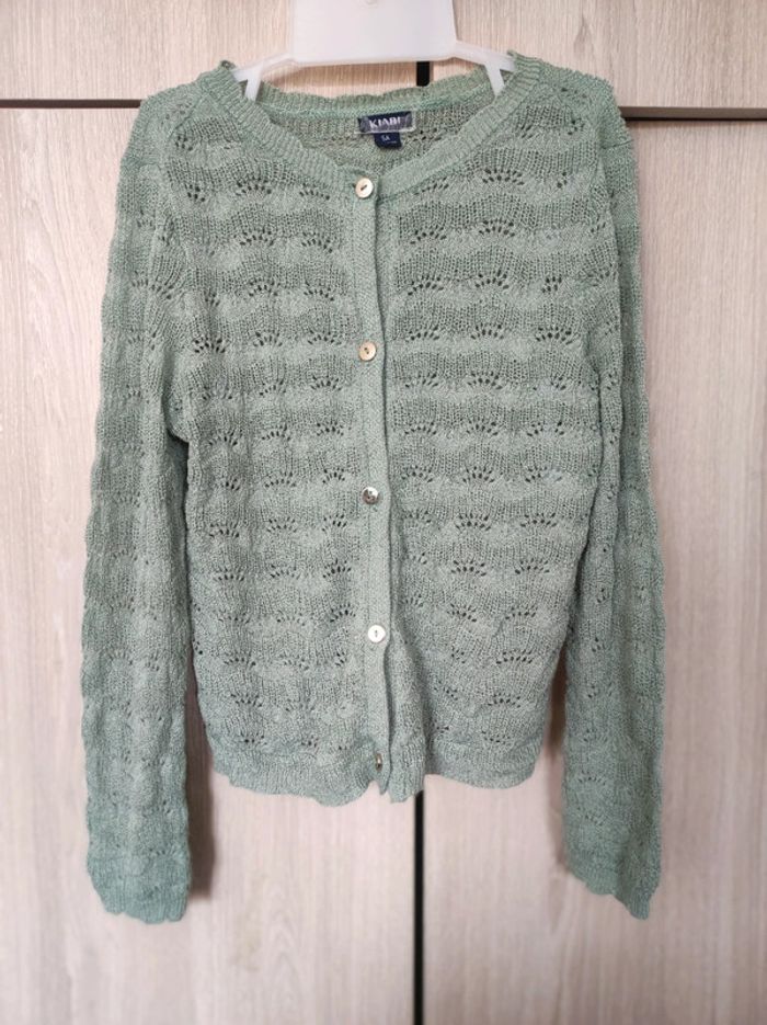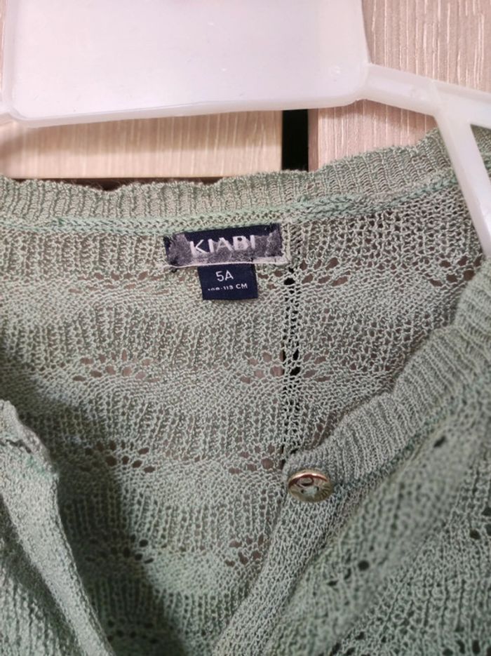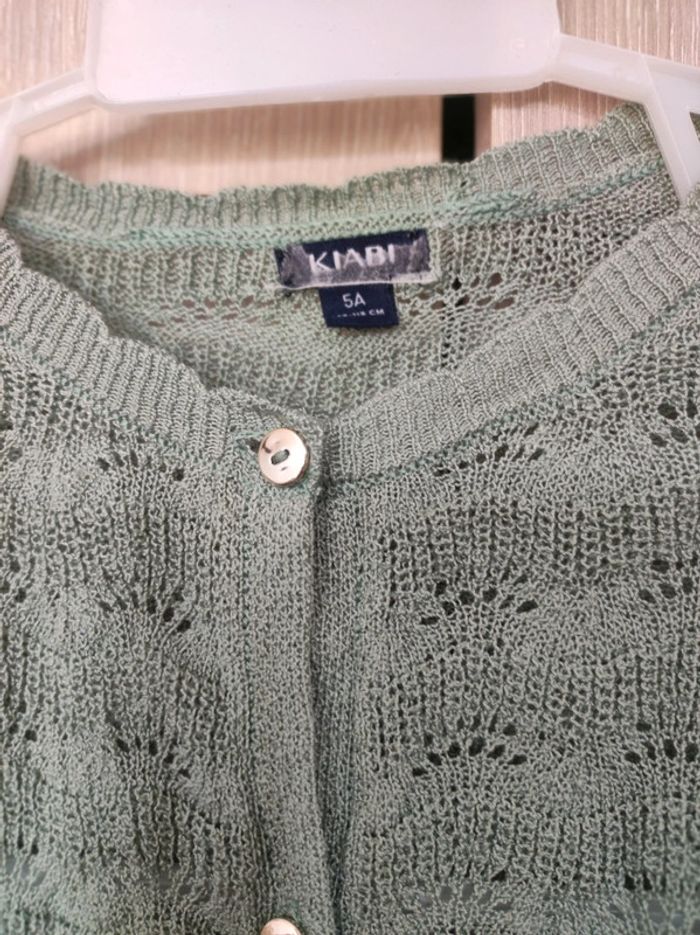 Gilet vert d'eau Marque Kiabi 5 ans En maille style crochet dentelé fine. Fermeture par boutonnière doré . Col avec petit effet dentelle. Manches longues. Parfait état comme neuf. #jemholofille5ans