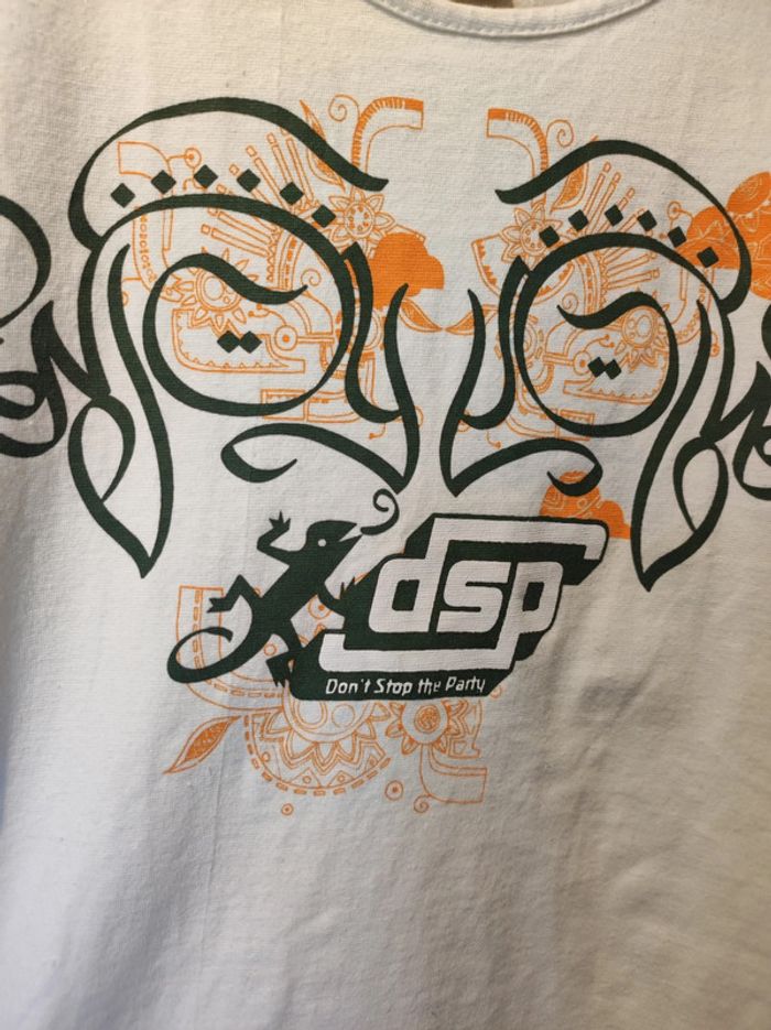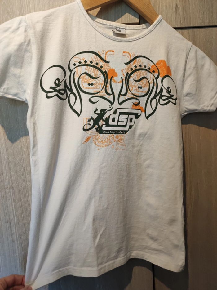 T shirt style tatouage / graphique. Publicitaire / desperados / despe / dsp Indiqué taille M (du Bangladesh donc clairement un taille S voir XS ! ). Col rond petite manche. Couleur blanc avec motifs noir et orange. Création et fabrication par passion coton du Bangladesh. Pour voir les autres articles de mon dressing dans cette même taille : #jemholofemme34 #jemholofemme36