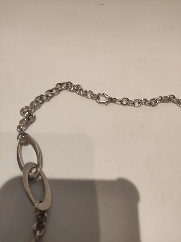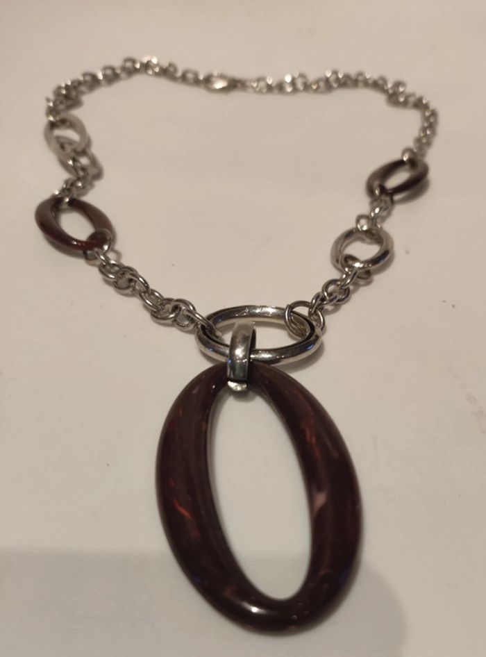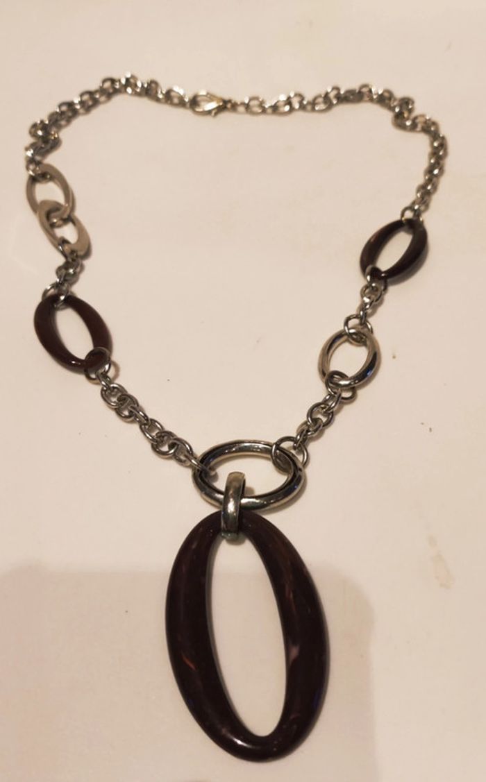 Collier fantaisie type matinée (60 cm de long en tour ) En métal argenté et boucle plastique prune avec du rose pour un effet marbre. Fermoir métal. Parfait état.