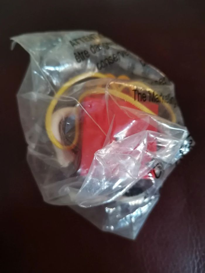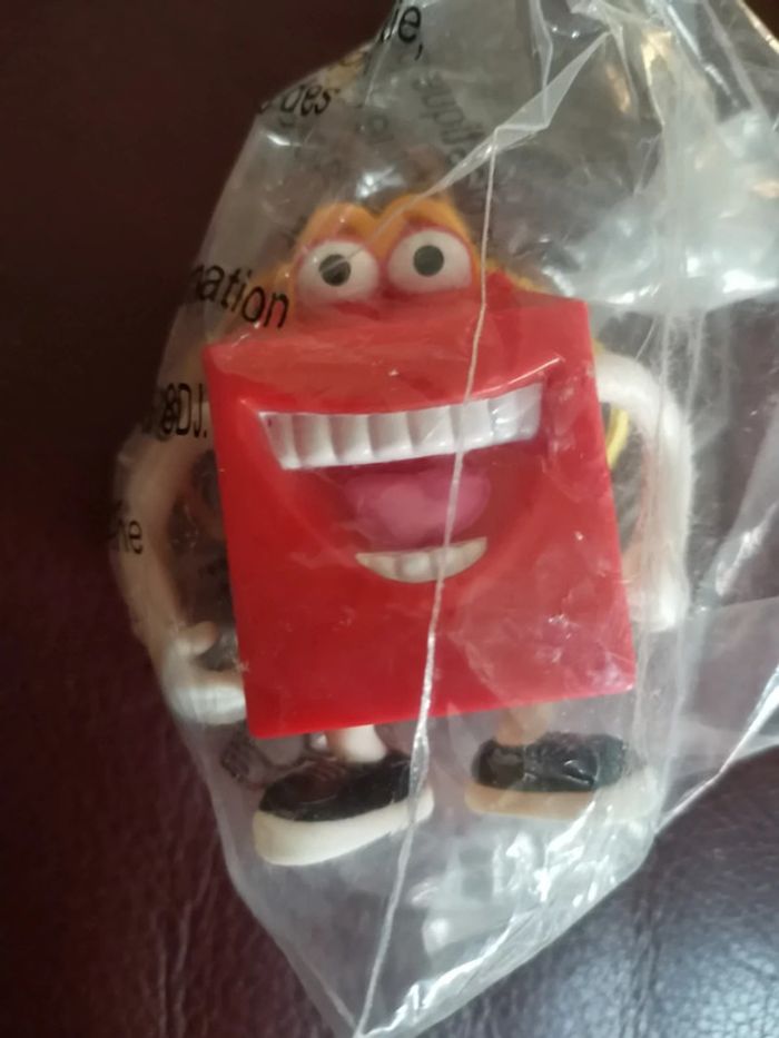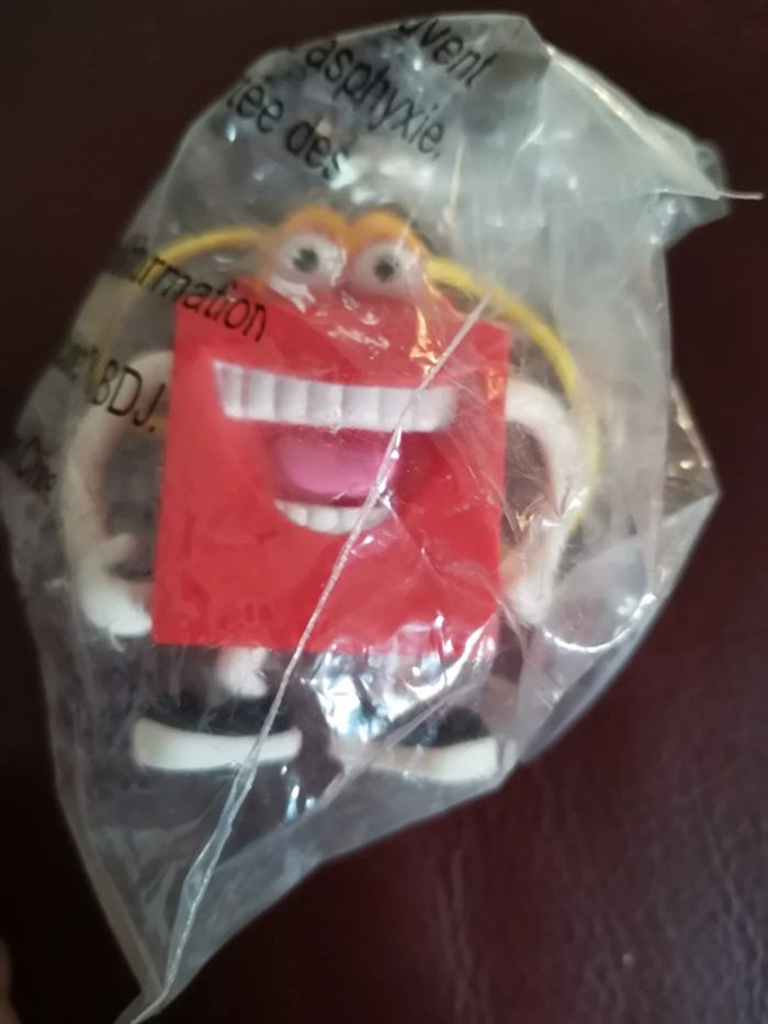 Porte clef du personnage happy de Mac do. Hauteur 7 cm. En plastique. Couleurs rouge et jaune. Petit cordon jaune pour accrocher. Neuf sous blister.
