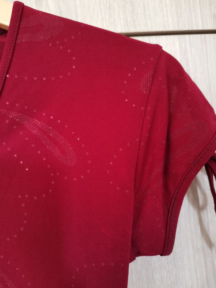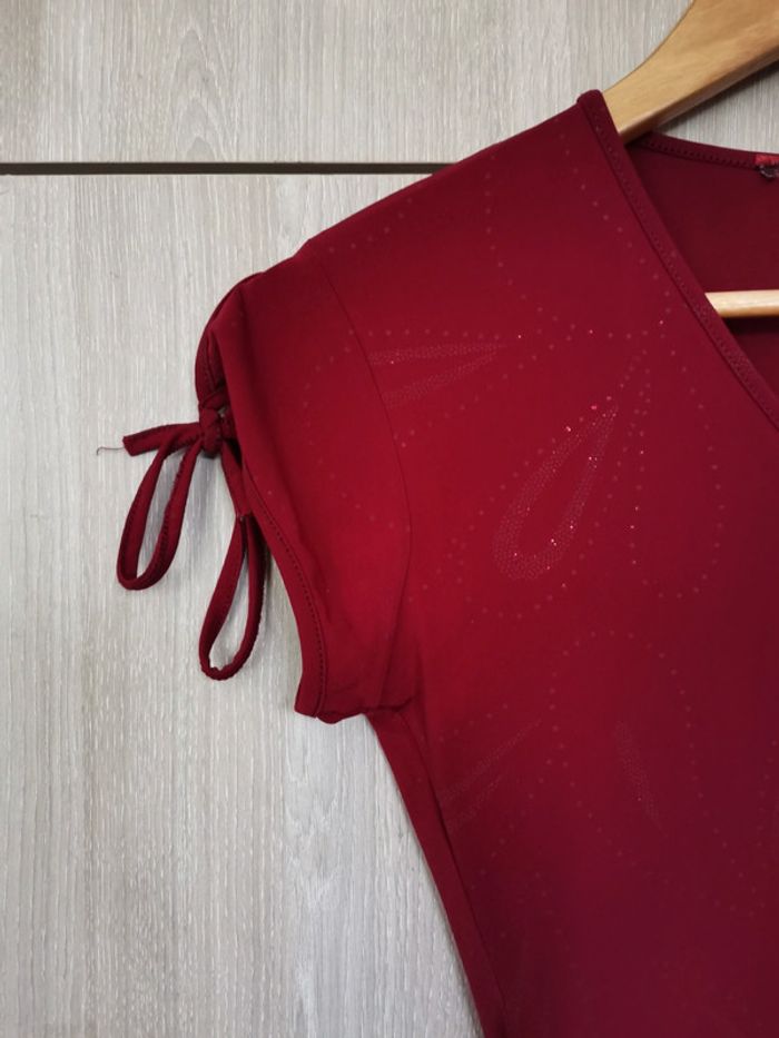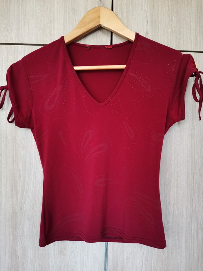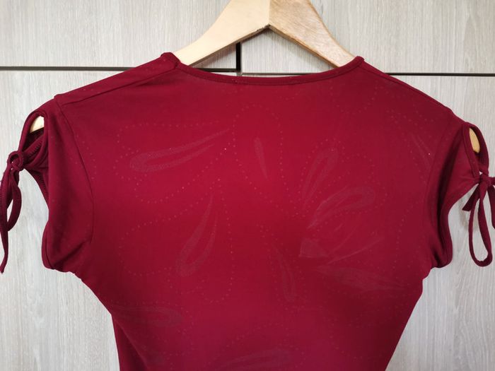 T shirt rouge bordeau avec petit dessin imprimé discret. Manches avec flot rouge. Très joli décolleté en v. C est un taille xs. Il est en parfait état. La matière est douce et élastique (synthétique). Il est en parfait état mais j'ai coupé toute les étiquettes. Pour voir les autres articles de mon dressing dans cette même taille : #jemholofemme34