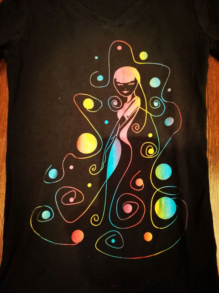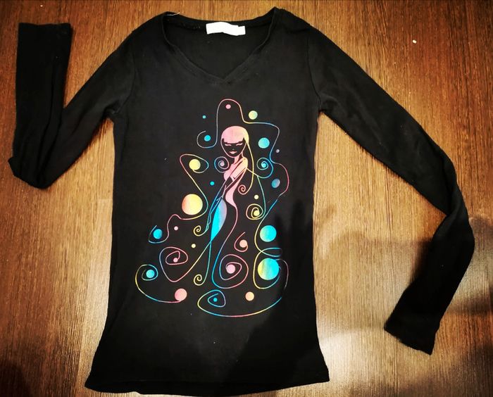 Pull fin cache cache (matière un peu comme un sous pull). Avec motifs colorés de stylisme brillant metalliques représentant une femme et des bulles. Motif tout petit peu craquelé mais c est léger, comme sur photo. Encore en bon état. Taille 1 (soit 34-36 ou 16 ans). 100 % coton. La couleur noir est plus clair que sur la photo.
