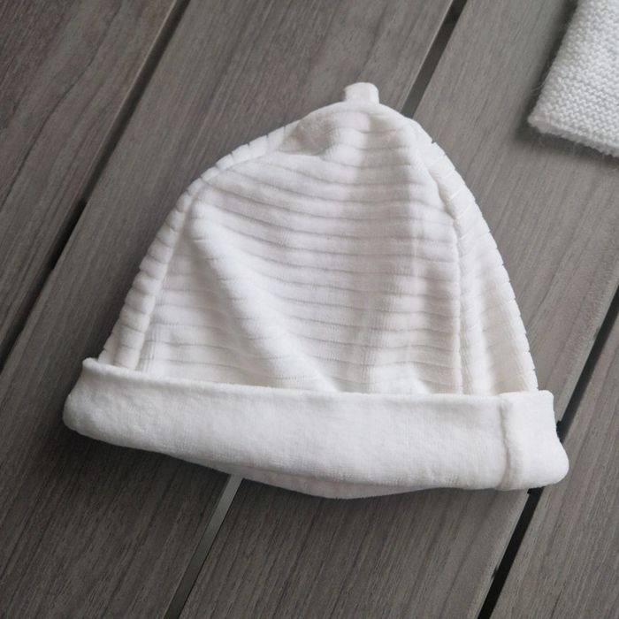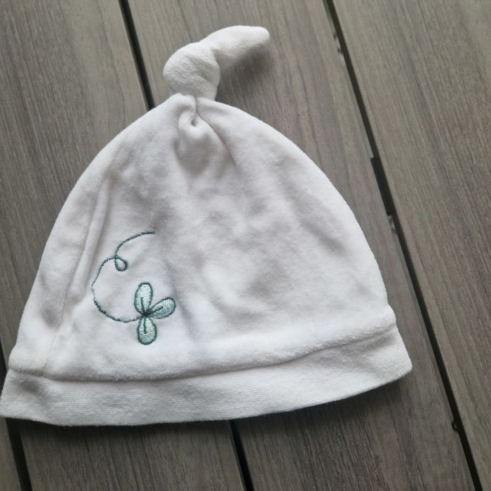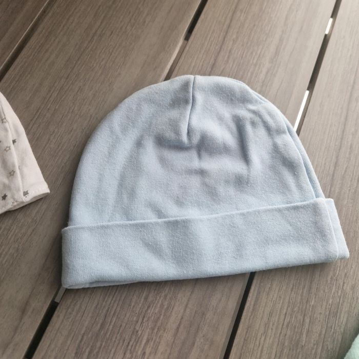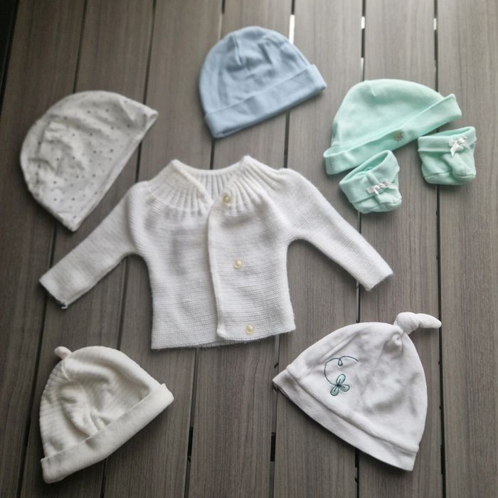 5 Bonnets (1 Vertbaudet, les autres je ne sais pas) et un gilet pour la naissance, en très bon état.