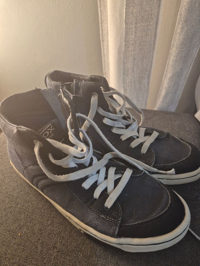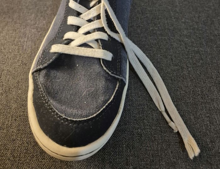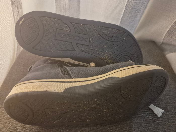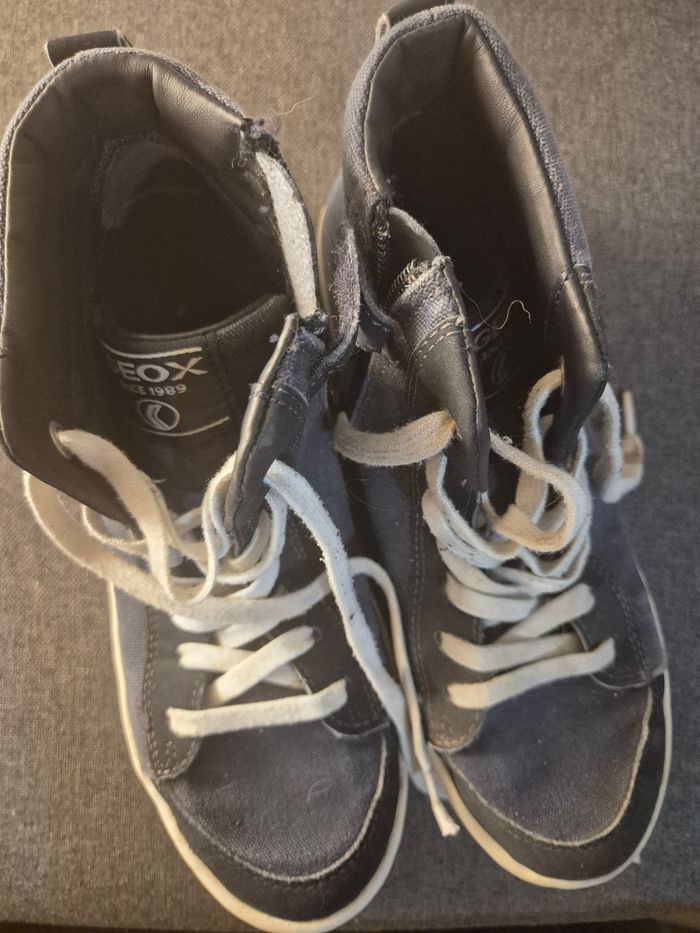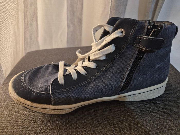 Basket Geox bleu marine Taille 36 Se ferme ou avec les lacets ou fermeture éclair sur le côté. Lacets abîmés au bout. Couleur légèrement délavé, semelle légèrement abîmé, à des endroits couleurs semelle abîmée Chaussure mise 7 fois max.