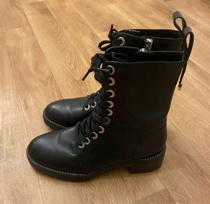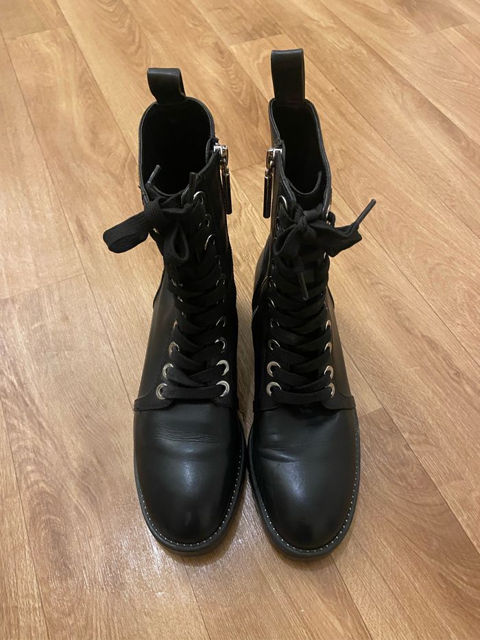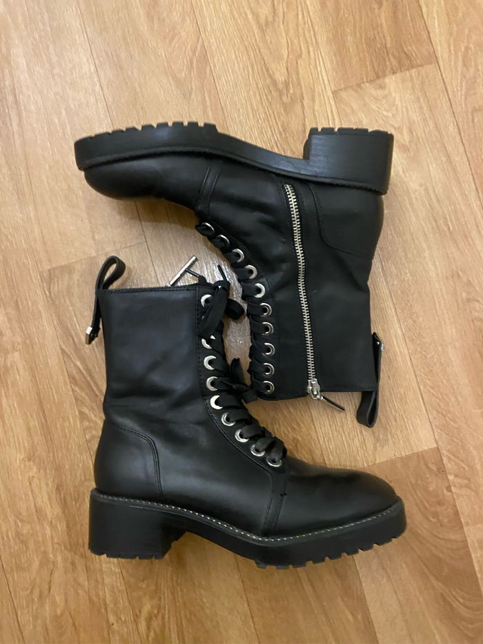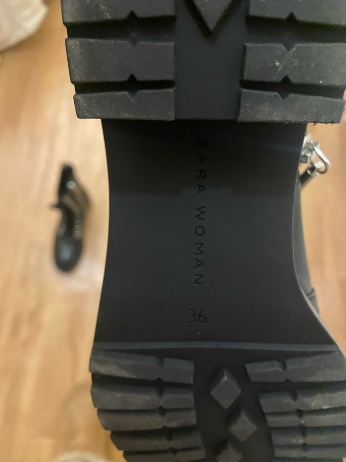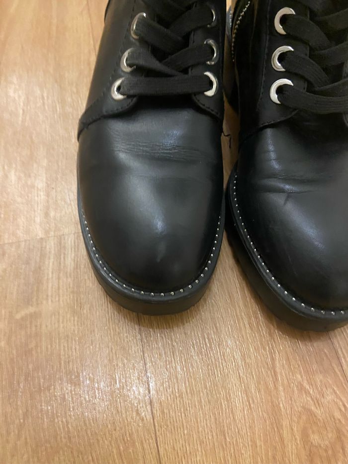 Bottines noires Cuir synthétique 36 Hauteur tige 21 cm Hauteur talon 4 cm Semelle épaisse 3 cm Très bon état juste légère trace discrète d’usure voir deux dernières photos