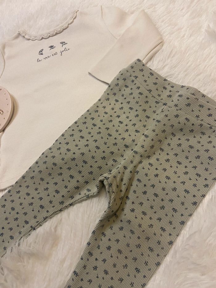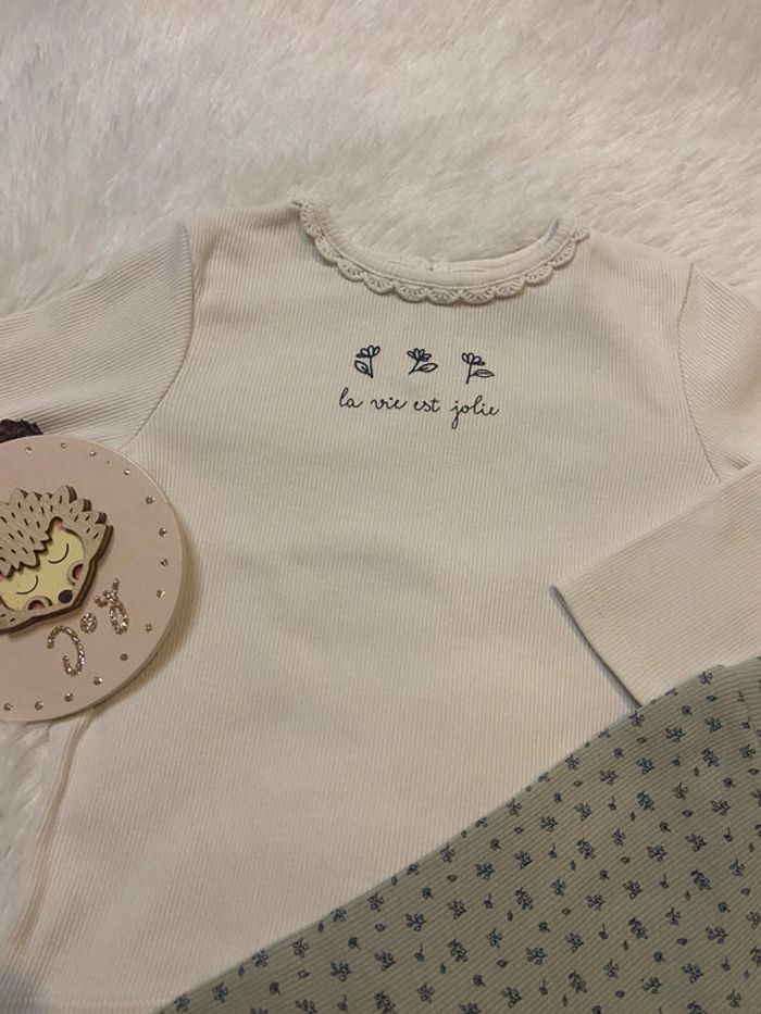 Description 🌸 : Adorable ensemble pour bébé, taille 12 mois. • Marque : Kiabi • État : Très bon état, aucun défaut (ni tâche ni trou). • Couleur : Blanc et vert clair. • Détails supplémentaires : ensemble haut manche longue avec col en dentelle et leggings fleuri. N’hésitez pas à me contacter pour plus d’informations ou des photos supplémentaires ! ☀️