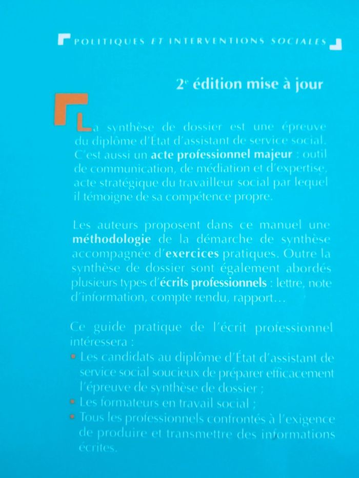 La synthèse de dossier en travail social Claudine Bolla-Scotto et Marcelle Orsoni Éditions ENSP Politiques et interventions sociales Candidats au DEASS, formateurs en travail social Très bon état 141 pages #lily2905jeuxjouetslivresbd