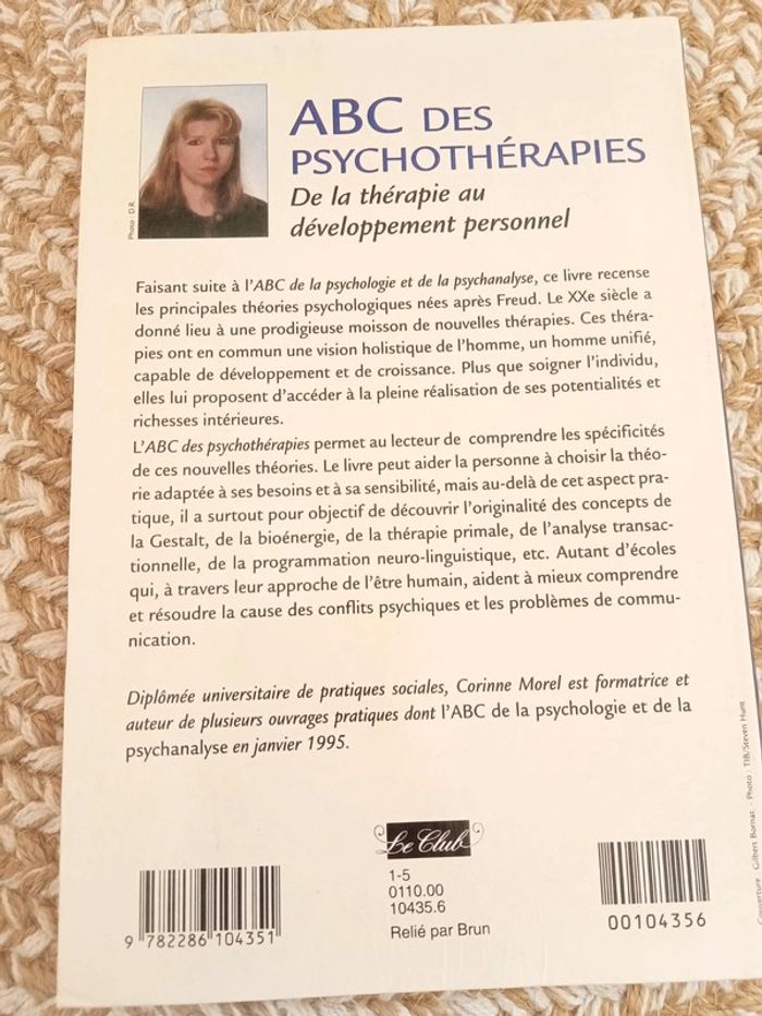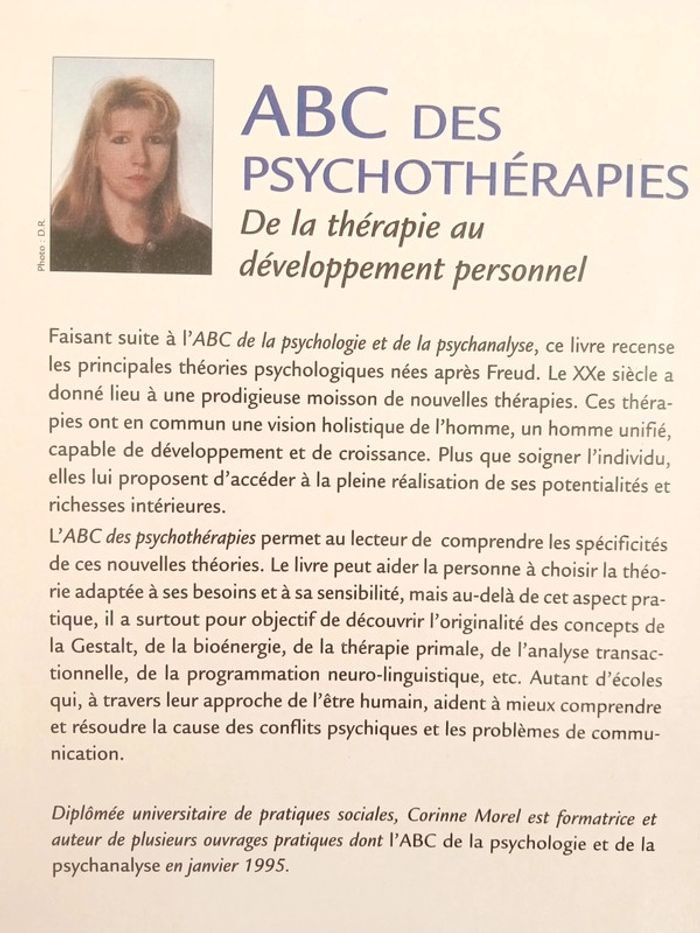 ABC des psychothérapies De la thérapie au développement personnel Psychologie Corinne MOREL Gestalt, bioénergie, analyse transactionnelle, PNL, thérapie primale, rebirth, hypnothérapie, psychodrame, rêve éveillé 250 pages 1997 Très bon état #lily2905loisirsjeuxjouetslivresBD