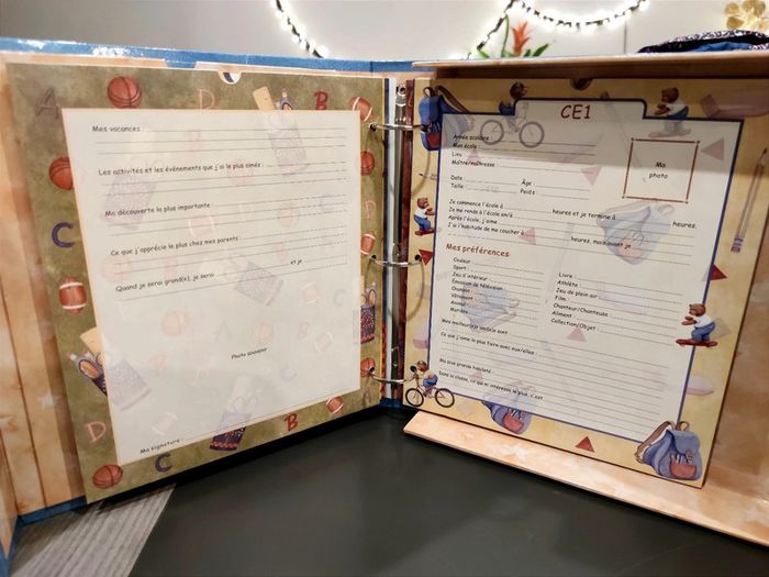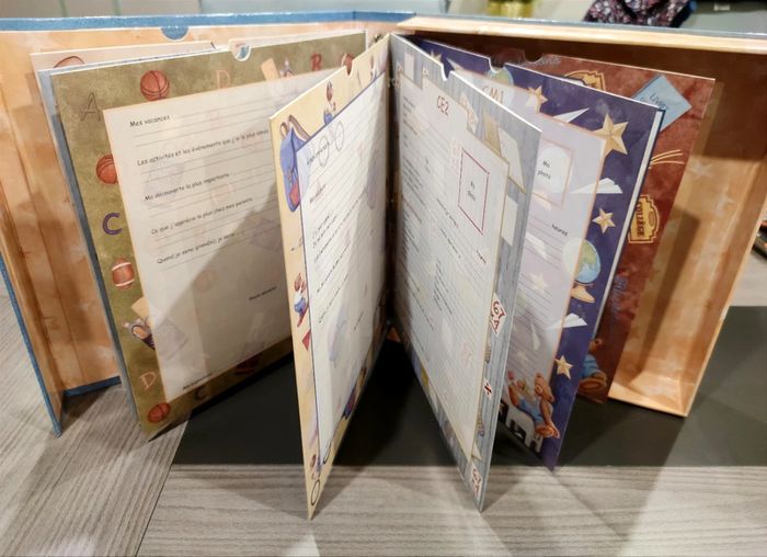Joli coffret pour y noter des souvenirs de la maternelle jusqu'au CM2 , pages cartonnées où vous pouvez y insérer la photo de classe de chaque année. D'autres emplacements sont prévus pour les photos d'identité ou autre ... Puis des choses à remplir comme les préférences, les souvenirs