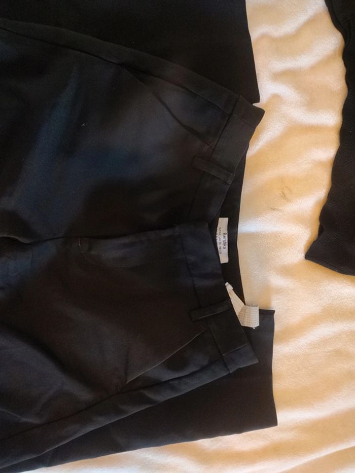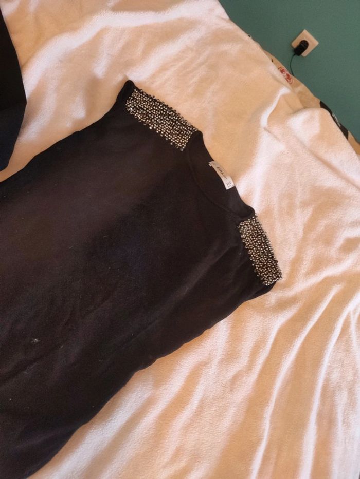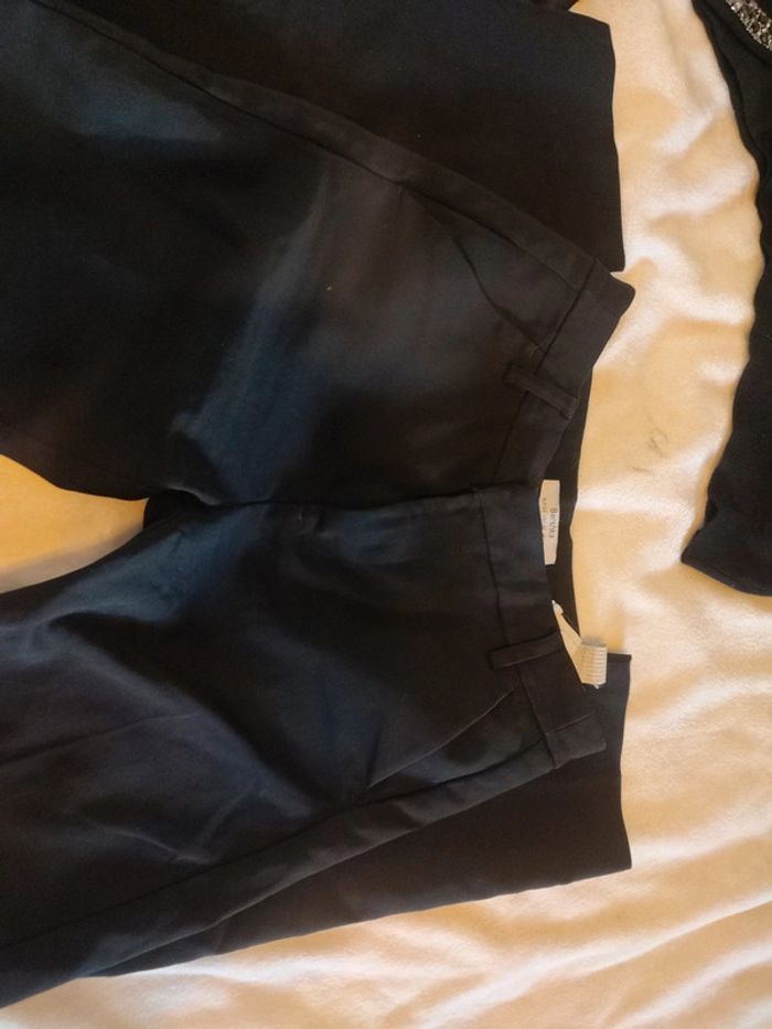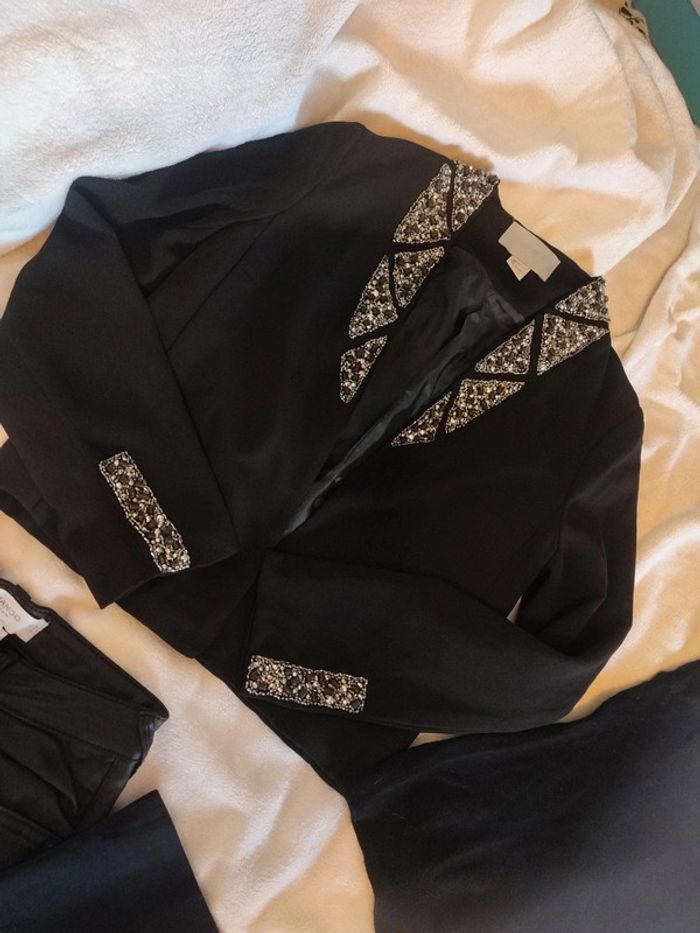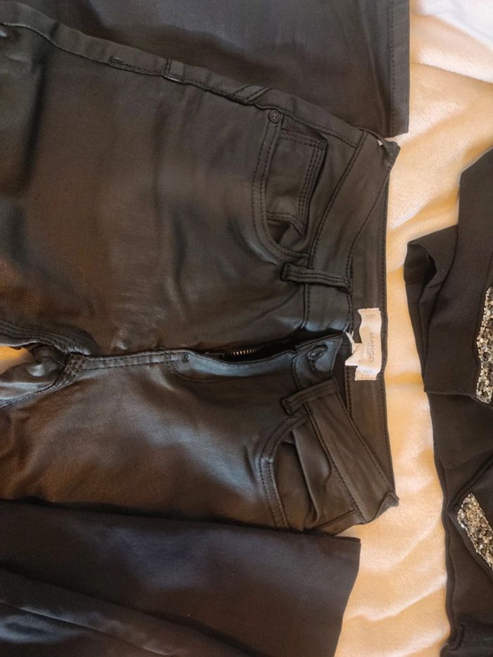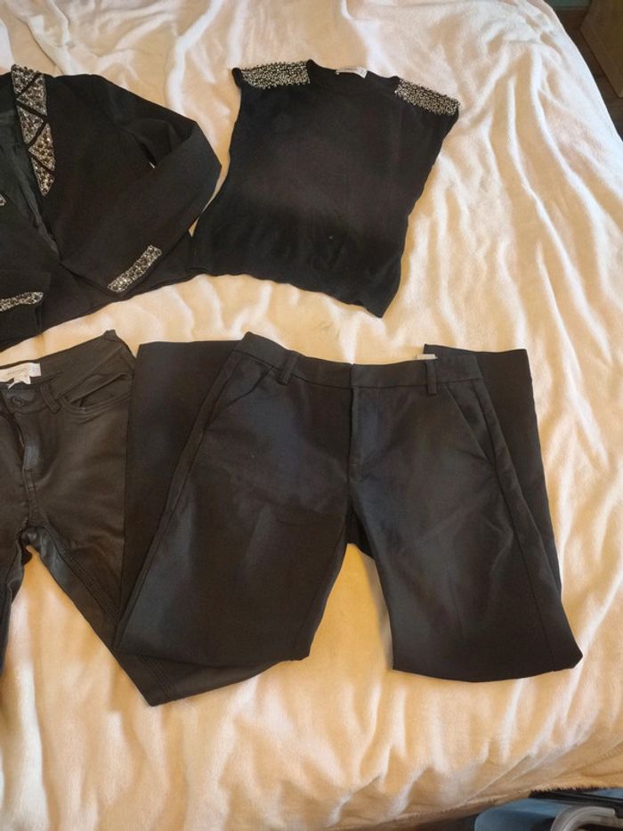 Lot de 4 pièces comprenant une veste a sequins h&m , un haut assorti Zara , pantalon enduit stretch Mango et pantalon de tailleur Bershka , pièces proches du neuf et neuves . Possibilité de vendre a l'unité