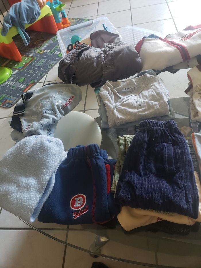 Le tout est en très bon état, diverses marques - 1 manteau - 2 vestes - 2 hauts de pyjamas - 2 bas de pyjamas - 3 pyjamas manches longues - 3 bodys manches courtes - 1 jogging - 3 pantalons - 1 t-shirt manches longues - 1 pull - 1 tshirt manches courtes - 2 short