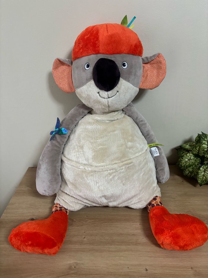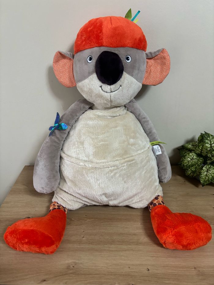 Très bon état ⚠️ attention cependant les 4 liens qui sortaient de la poche ont été coupées Plusieurs activités ( bruit de papier froissé , grelot , possibilité de mettre un pyjama dans la grande poche ) 66 cm Envoi rapide Valeur neuf en magasin 75 euros #peluchekoalamoulinrotydanslajungle #koaladanslajunglemoulinroty