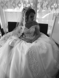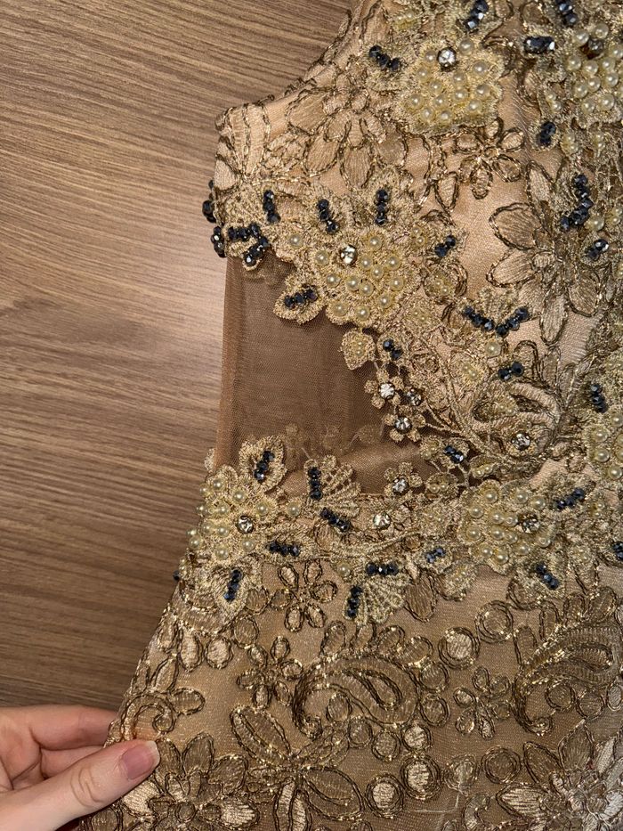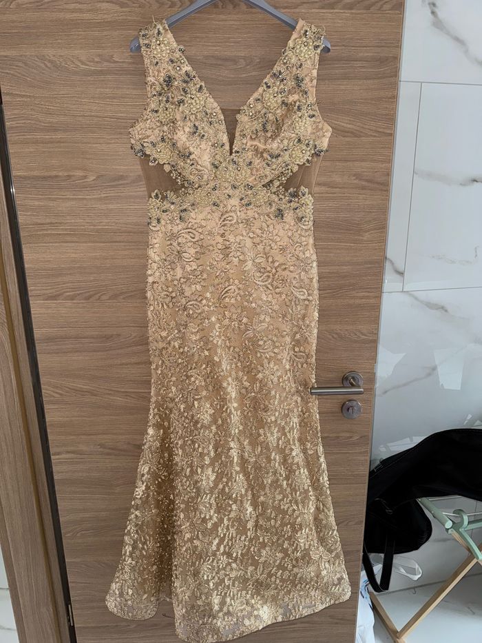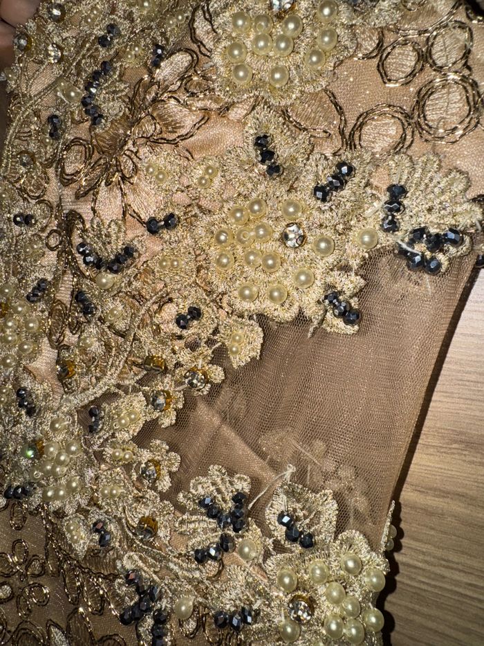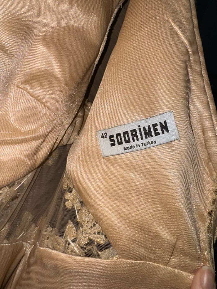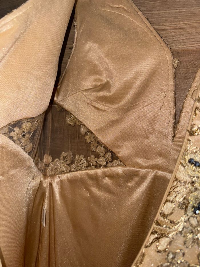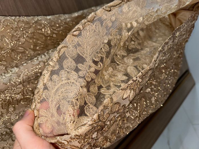 Porté 1 fois pour un mariage Taille 42 achetée dans un magasin de robe de mariée en Turquie. La housse est fournis avec. La robe est assez «  lourde » du à la qualité. 😉 Le bas a était retouchée car elle était trop longue voir photo , je peux donc mesurer la robe afin de voir si elle pourrais correspondre.