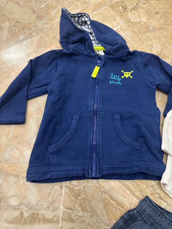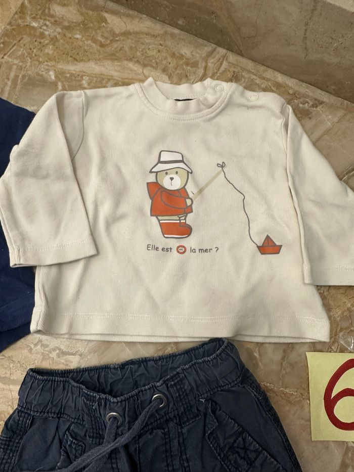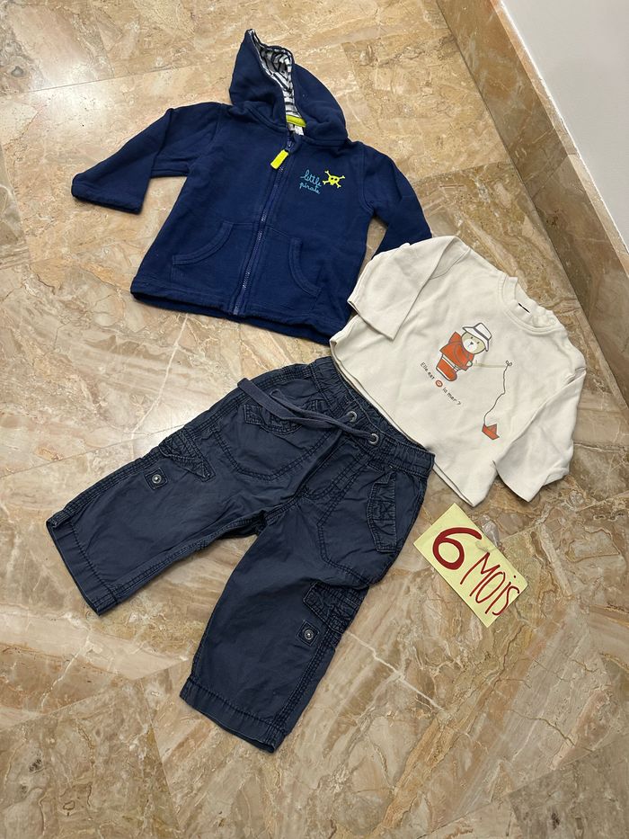 Pantalons h&m 6-9 mois Se remonte en pantacourt T shirt manches longues «  elle est ou la mer 6 mois » Gilet orchestra Little pirate 6 mois Le tout en très bon état N’hésitez pas à jeter un œil sur mes autres annonces #virginielp1703garcon6mois