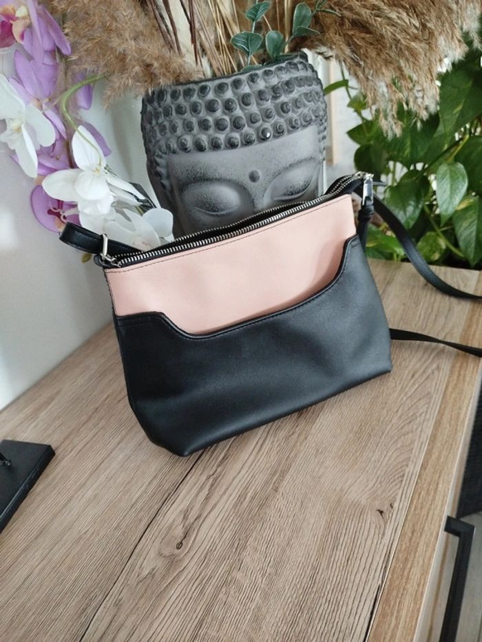 Petit sac très mignon noir et rosé pastel Petite pochette intégrée au sac Peu utilisé Un coin légèrement abîmé sur le dessous (cf dernière photo)