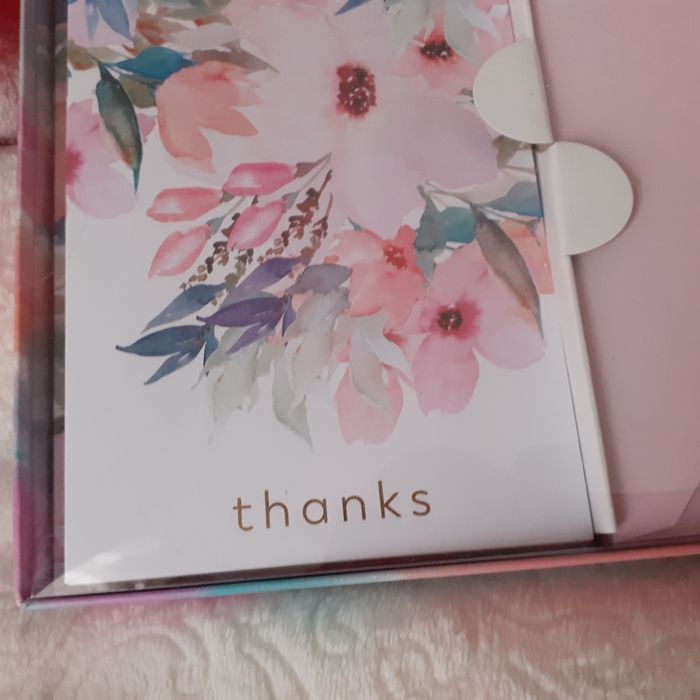 Coffret neuf comprenant 15 cartes doubles; motif floral; inscription "Thanks" en bas + 15 enveloppes rose pâle // voir photos pour détails. Coffret en carton renforcé, dessus en plastique transparent