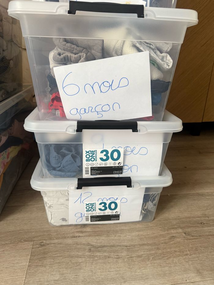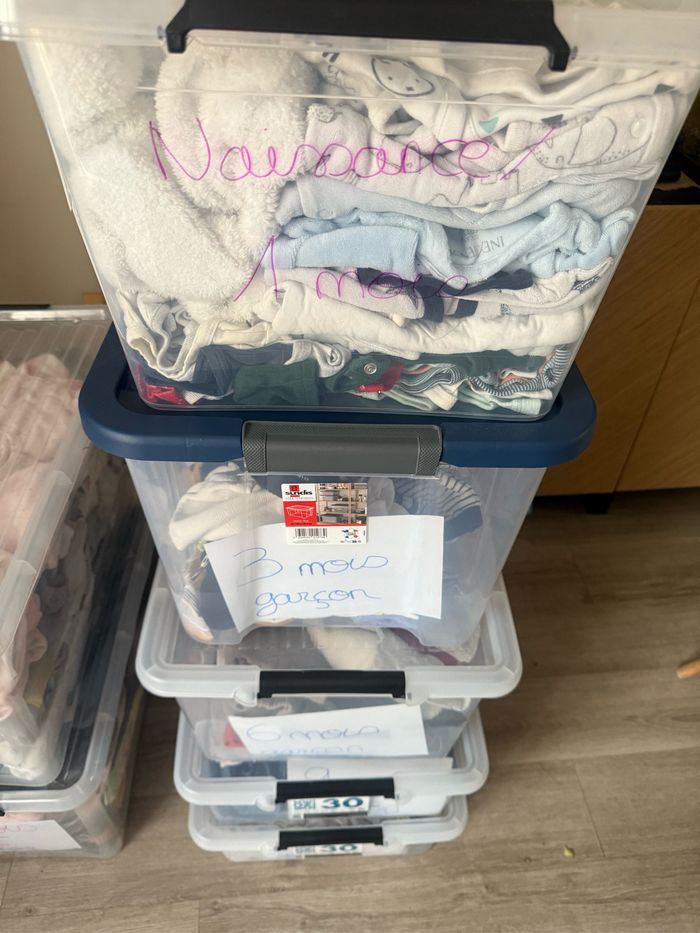 Caisse classer par taille et genre Fille : - 3 mois - 12/18 mois - 4 ans - 5 ans Garçon : - naissance/1 mois - 3 mois - 6 mois - 9 mois - 12 mois Les prix sont en lots et change en fonction du nombre de vêtements mais comme les vêtements ont déjà été acheter d’occasion et bien porter et pouvant présenter des taches ils seront à petits prix l’unités Me contacter pour plus d’infos et d’éventuelles photos
