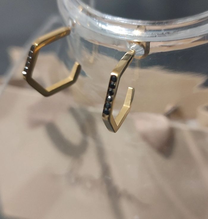 Boucles d'oreilles Bohm dorées avec strass noirs. Très jolies. Neuves. Emballage vendu séparément.