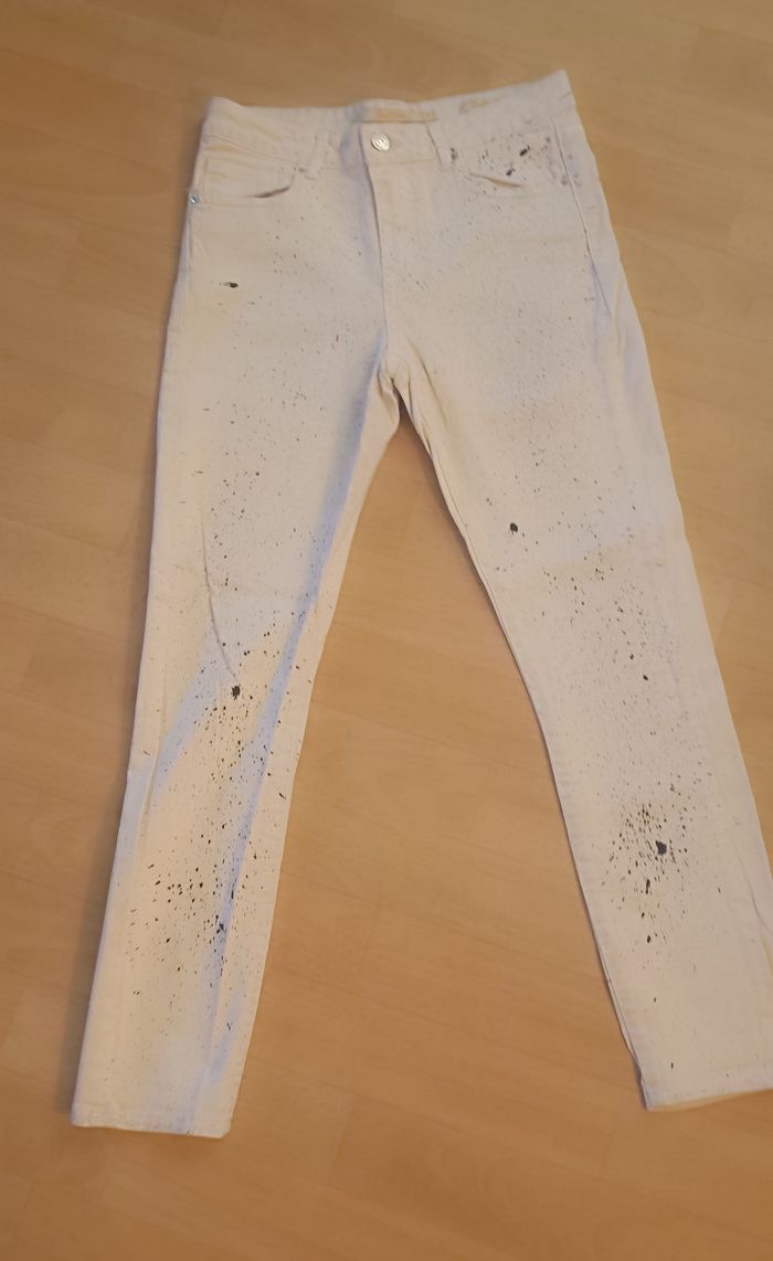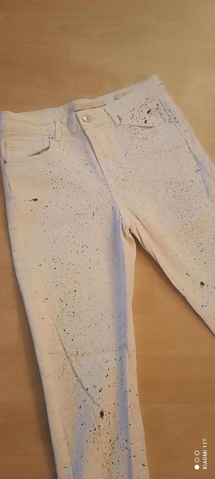 Jean femme taille 36 Zara Couleur blanc tacheté de noir Fermeture éclair + bouton 98 % coton 2 % élasthane Longueur total 90 cm Longueur prix de la taille à l’entrejambe 28 cm Largeur taille 36 cm Largeur cheville 13,5 cm Très bon état : aucune tâche aucun défaut