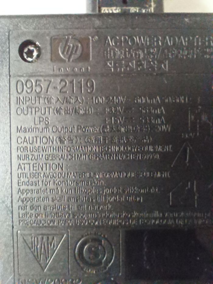 Tension d'entrée : 100V-240V Sortie : 32V - 563mA, 15V - 533mA Prise spécifique HP, verte Convient aux modèles : HP Deskjet 3900, 3920, 3930, 3940, 4315, 4355, D132, D2330, D2345, D2360, F335, F340, F370, F378, F380, F388, F735, F2128 HP Officejet 4315, 4315v, 4315xi, 4355
