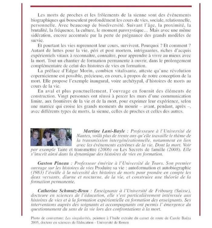 Histoire de morts au cours de la vie Gaston Pineau, Martine Lani-Bayle, Catherine Schutz-Brun Préface de Edgar Morin Éditions L'harmattan 2011 326 pages Excellent état Les morts de proches et les frôlements de la sienne sont des événements biographiques qui bousculent profondément les cours de vies, sociale, relationnelle, personnelle. Et pourtant les vies reprennent leur cours, survivent. Pourquoi ? Et comment ? Autant de luttes pour la vie, péri et post mortem, intrigantes, riches d'acquis expérientiels vitaux à reconnaître, connaître, pour apprendre à vivre au mieux avec la mort. Tout un chantier de formation permanente à ouvrir, dans le prolongement complémentaire de celui des histoires de vies en formation. Psychologie, sciences humaines, sociologie, anthropologie, ethnologie, accompagnement de fin de vie, droit, soignants, intervenants sociaux #lily2905jeuxjouetslivresbd