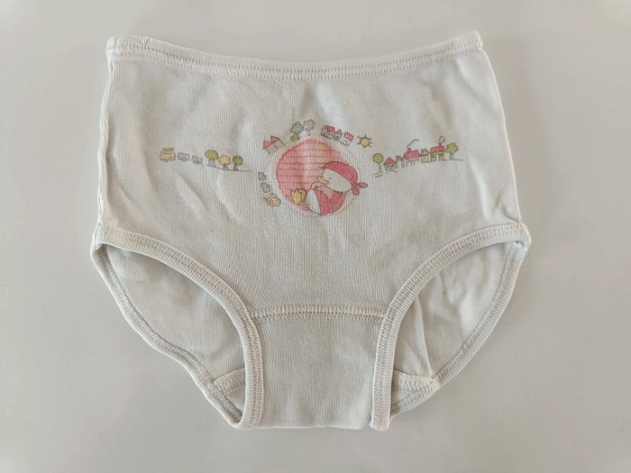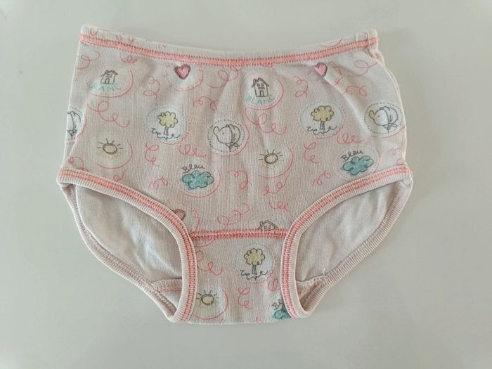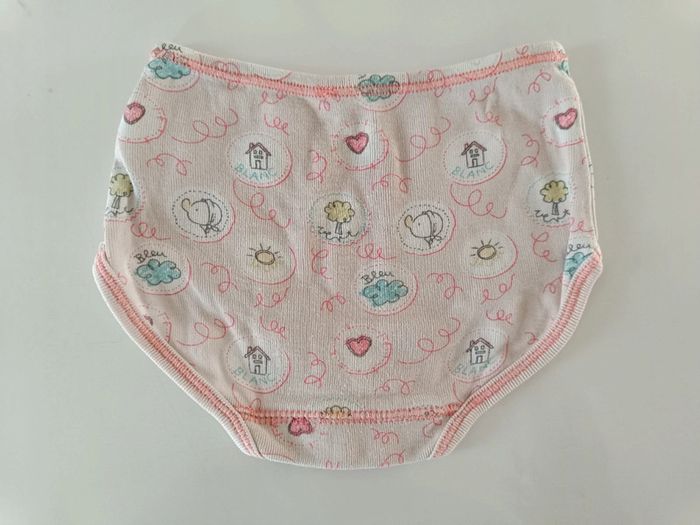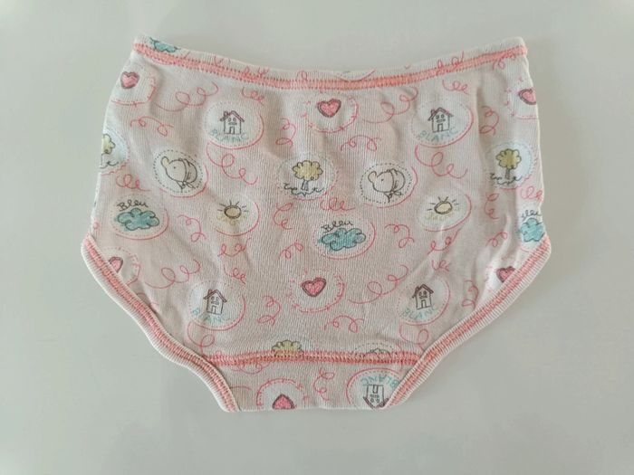 Culotte qui se porte sur la couche. - Blanche avec dessin de canard, maisons, arbres et petits trains. Présence d'une tâche (photo). - 2 Roses avec dessin de soleils, arbres, nuages, maisons, cœurs. Article sans trou. Taille : 9 mois / 71 cm. #melody45340bebe9mois
