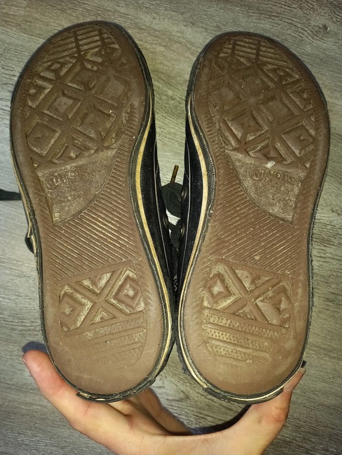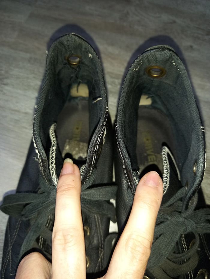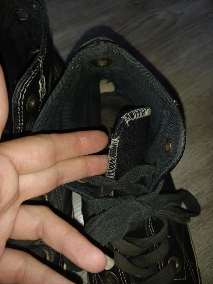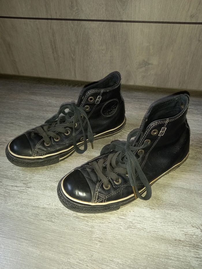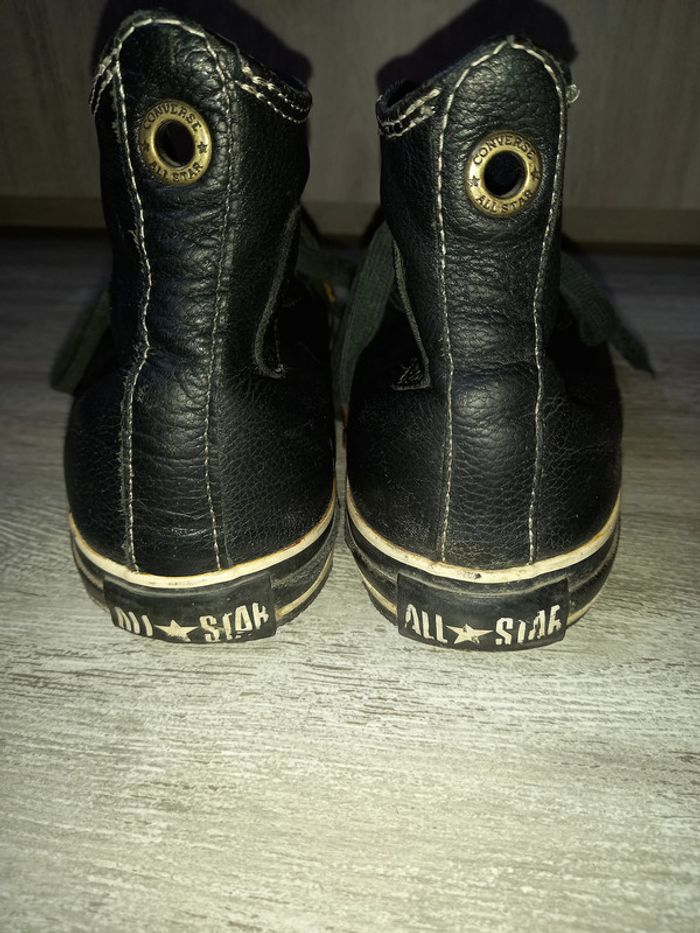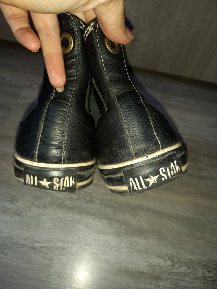 basket montante bord blanc en cuir converse pointure 38, bien porté mais en bon état, tissu usé à l'intérieur derrière le talon, usure normal des semelles, se décollent légèrement par endroit sur le tour #chaussurefemmepetitefee3