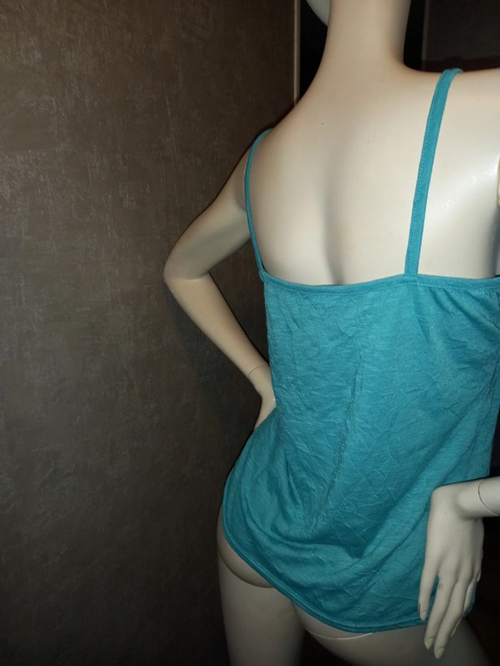 top turquoise froufrou devant taille 40, largeur aisselle à aisselle 44 cm, longueur du dessous de bras à en bas 43 cm, étiquette composition coupée mais matière élasthane #40petitefee3