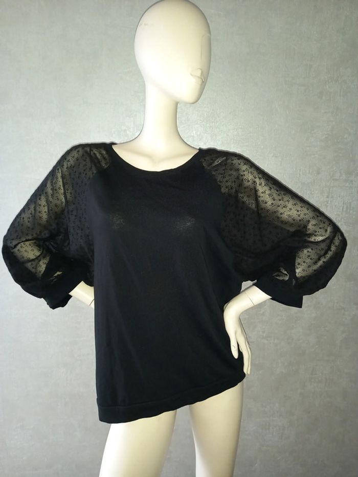 tee shirt manche voile motifs promod taille 42, étiquette composition coupée, matière manchenon élasthane, largeur aisselle à aisselle 56 cm, longueur de l'épaule à en bas 65 cm #42petitefee3