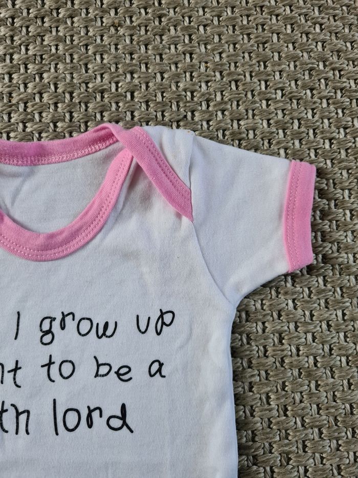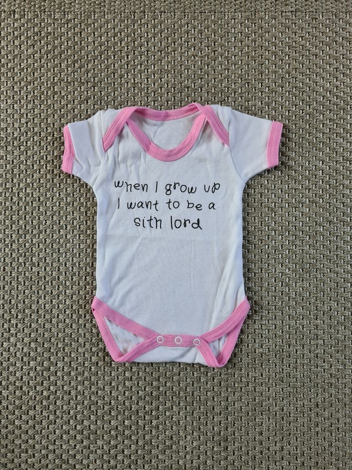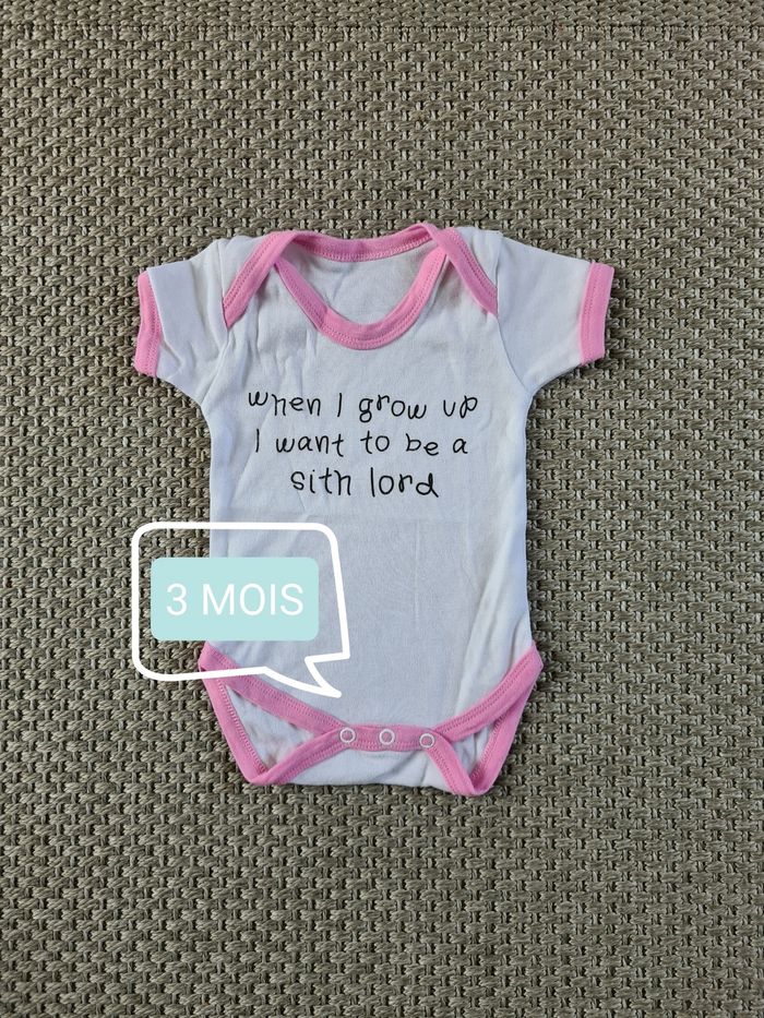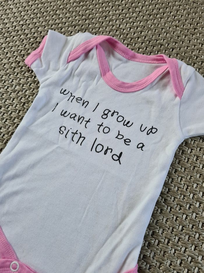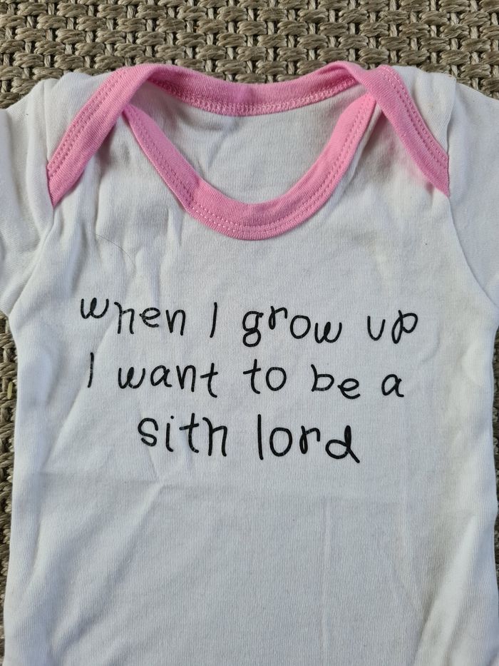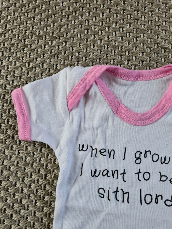 Bodie rose et blanc avec texte sur star wars "sith". Jamais porté il est comme neuf. Idéal pour l'été. Taille 0/3 mois - marque inconnue