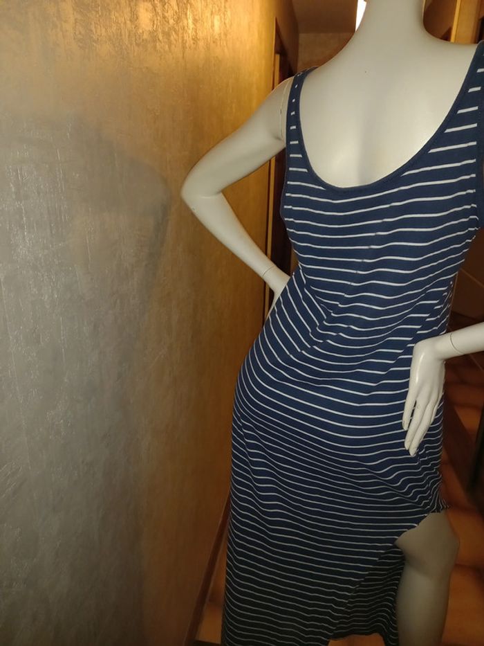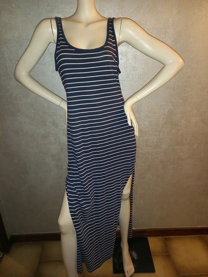 robe rayé bleu marine et blanche fendue sur les cotés, marqué taille L et taille 40/42, largeur aisselle à aisselle 46 cm, longueur du dessous de bras à en bas 118 cm, matière coton
