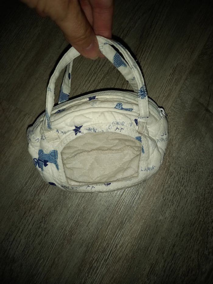 petite pochette en tissu avec fermeture éclair, blanche avec motifs bleu, longueur 14,5 cm, hauteur 9 cm, 1 coté avec plastique transparent #sacpochettepetitefee3