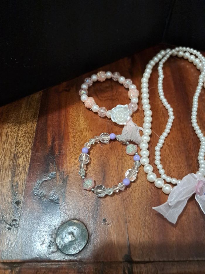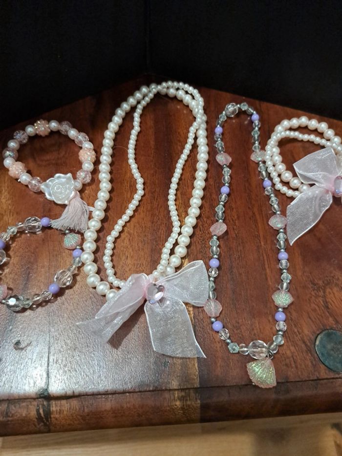 Lot colliers bracelets princesse bon état. Collier +bracelet coquillages. Collier + 2 bracelets princesse