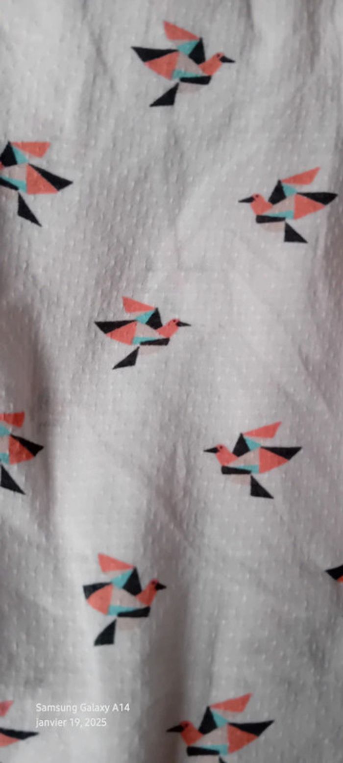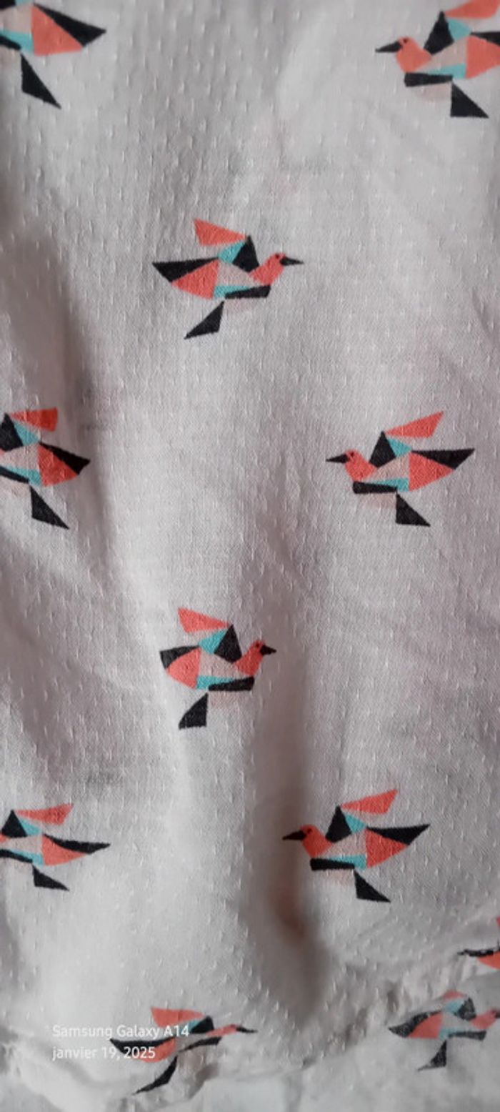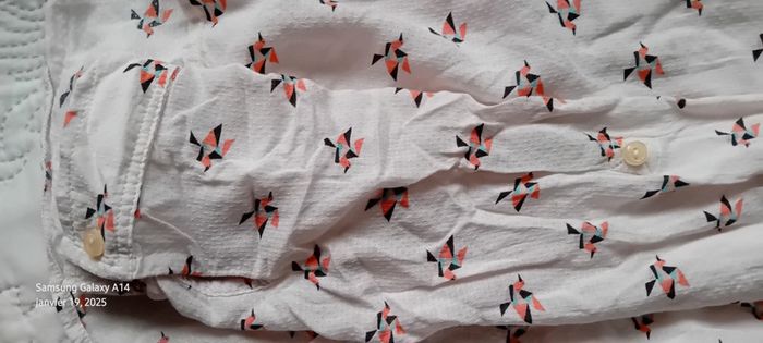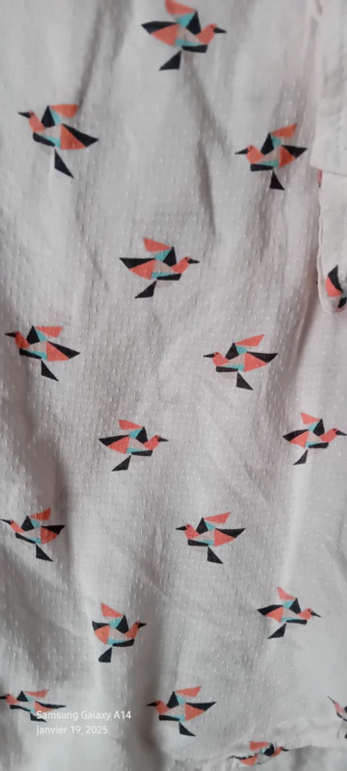 Blouse légère en viscose décolleté en V manches ajustables avec un lien et bouton motif oiseaux colorés façon origami tissus aspect point relief Longueur 66 cm largeur aisselles à aisselles 46 cm largeur épaules 43 cm longueur manches 36 à 58 cm bouton de rechange fourni très peu portée en très bon état #midole #midolefemme #midolefemme36 #blousefemme36 #blousemotiforigami #promod #rose #femme36 #blousemotifoiseaux #viscose #