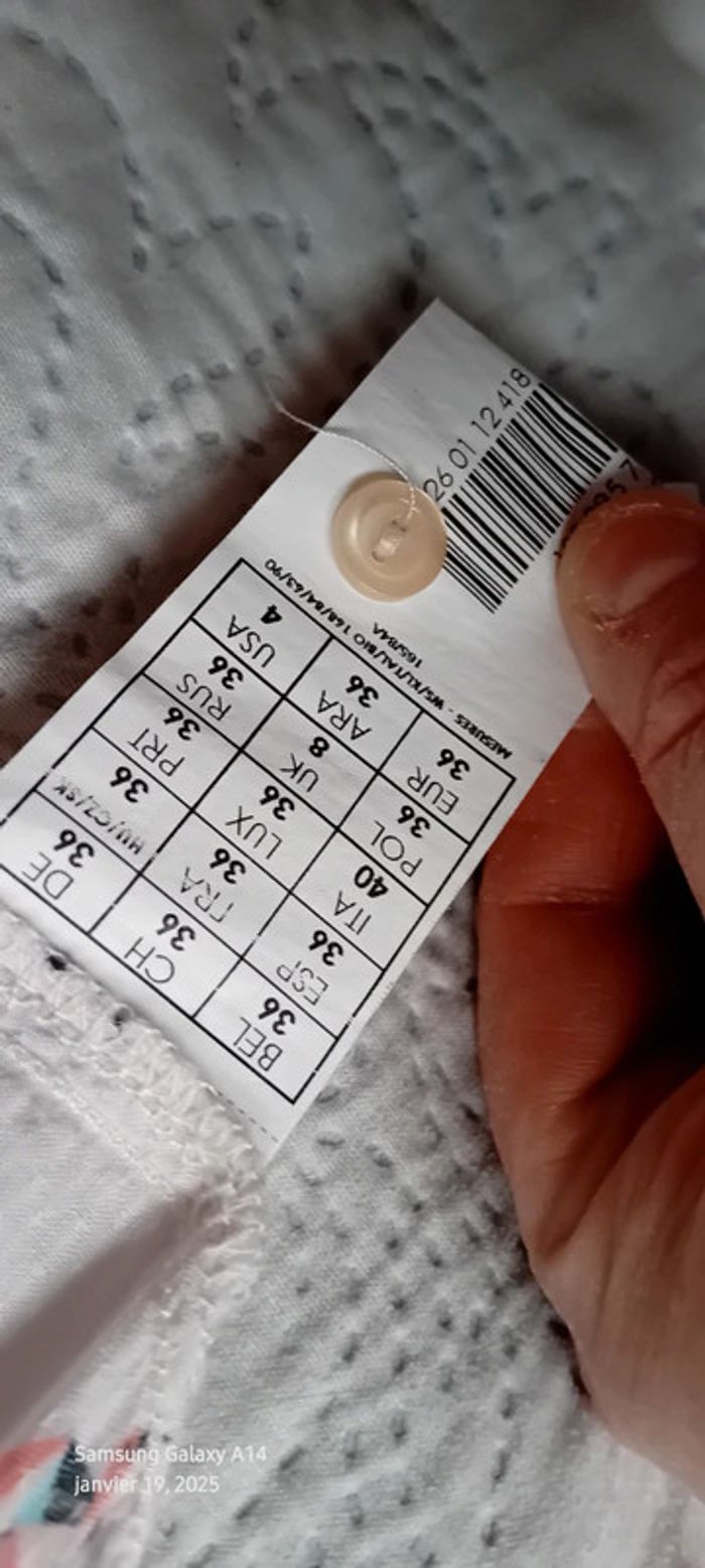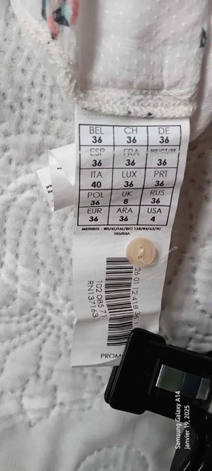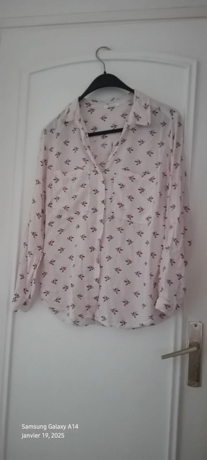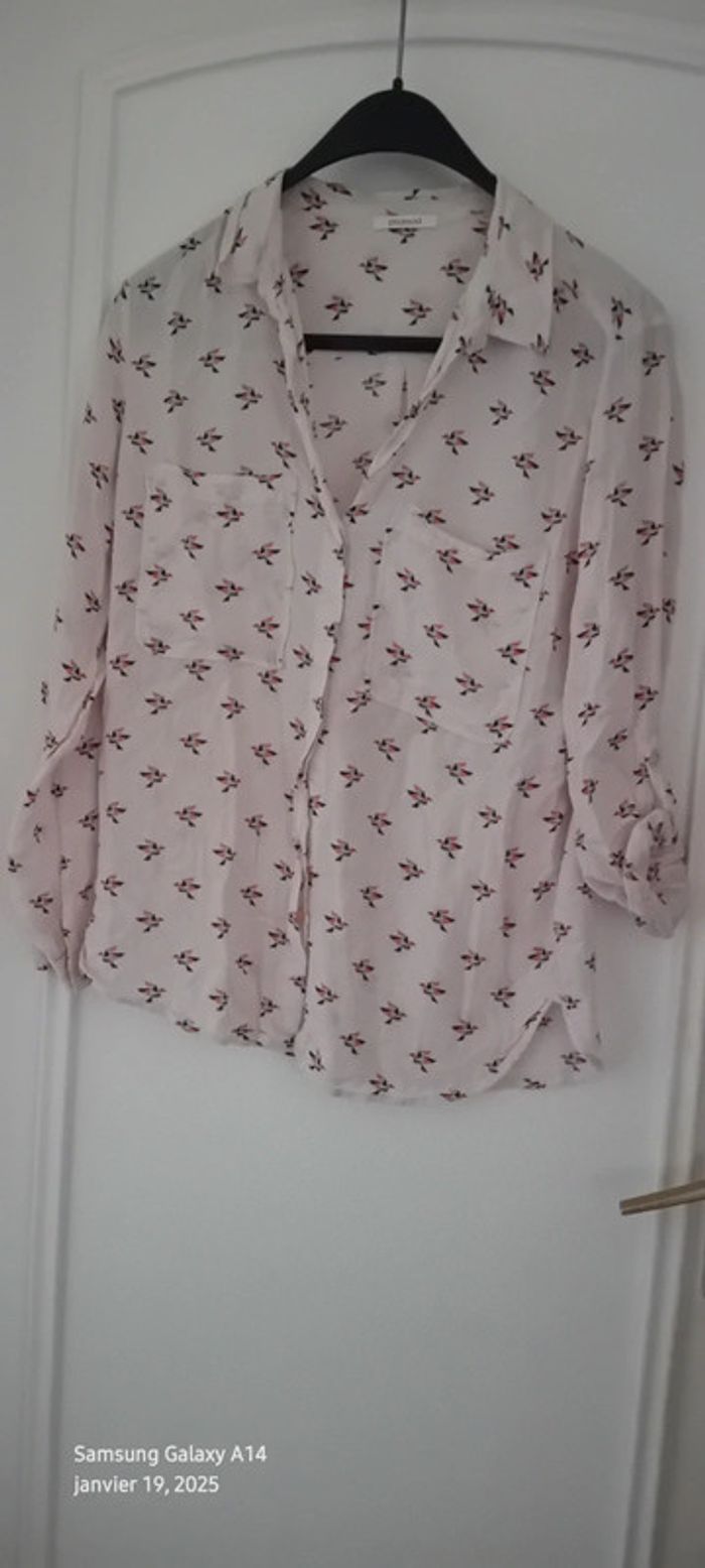 Blouse légère en viscose décolleté en V manches ajustables avec un lien et bouton motif oiseaux colorés façon origami tissus aspect point relief Longueur 66 cm largeur aisselles à aisselles 46 cm largeur épaules 43 cm longueur manches 36 à 58 cm bouton de rechange fourni très peu portée en très bon état #midole #midolefemme #midolefemme36 #blousefemme36 #blousemotiforigami #promod #rose #femme36 #blousemotifoiseaux #viscose #