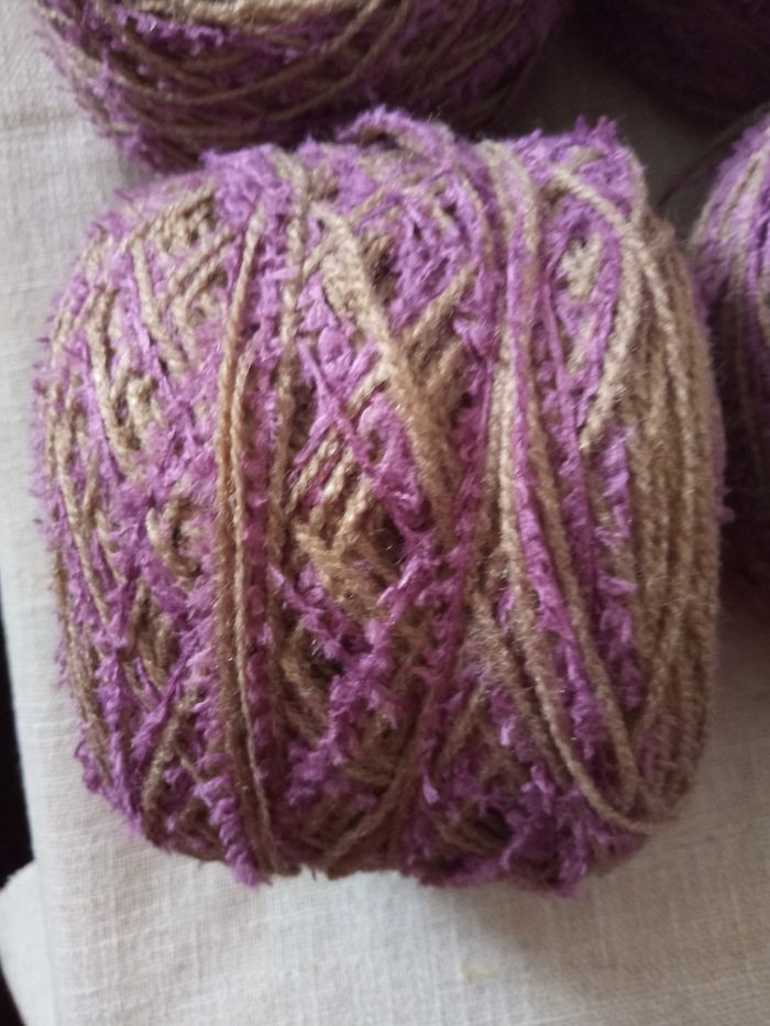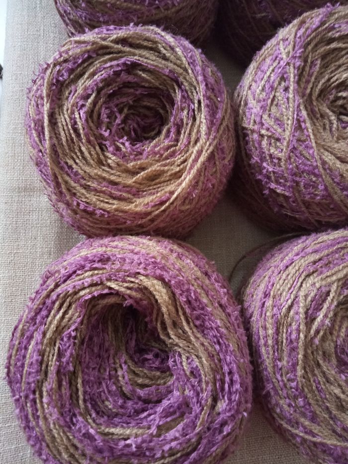 Lot de 6 Pelotes Fantaisies (500g) Couleur: Marron et Violet 2 fils de taille différente dont 1 fantaisie au total 500g Aiguilles N°2,5 environ Lot en parfait état