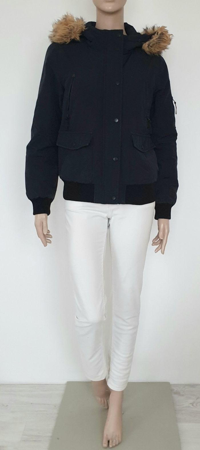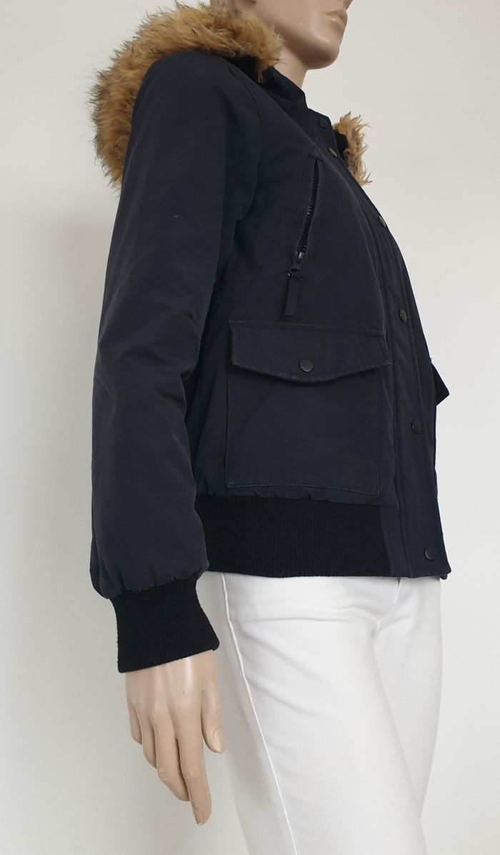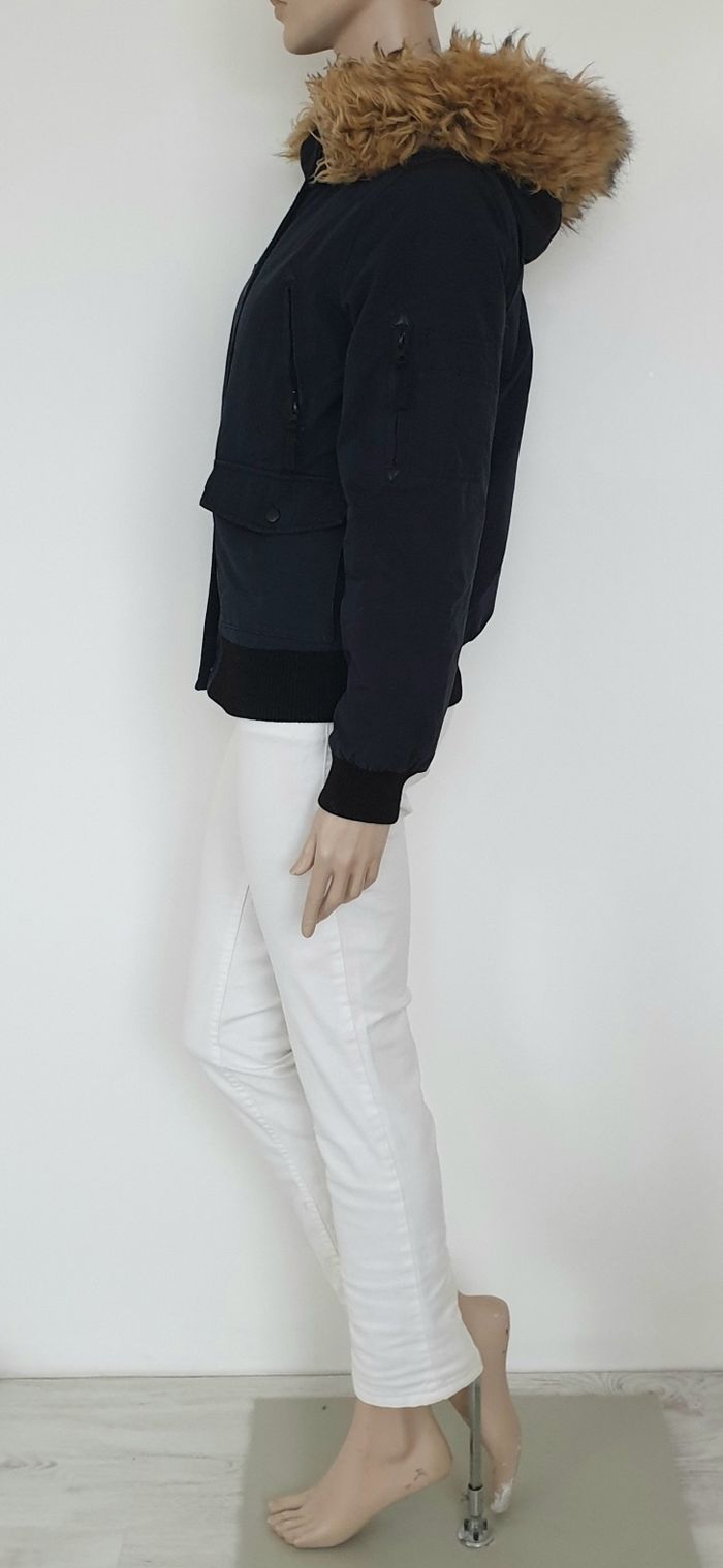 Un blouson noir à capuche de 61cm de long Largeur épaules 41cm Aisselles à aisselles 48cm Fourrure amovible 5 poches dont une aux bras Pimkie Taille 36