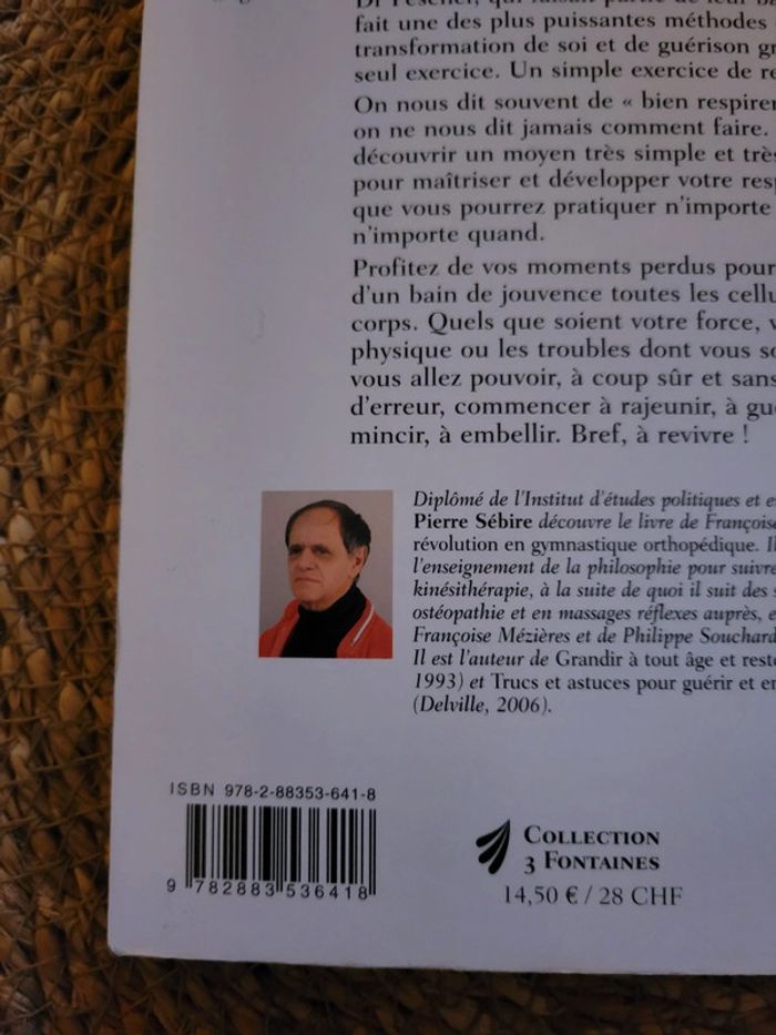La fontaine de Jouvence aurait-elle été découverte au début du siècle dernier, par une bande de gamins jouant autour du lavoir municipal d'un petit village du Limousin ? Au début, ce n'était qu'un jeu d'enfants. Mais le Dr Pescher, qui faisait partie de leur bande, en a fait une des plus puissantes méthodes de transformation de soi et de guérison grâce à un seul exercice. Un simple exercice de respiration ! On nous dit souvent de " bien respirer ", mais on ne nous dit jamais comment faire. Vous allez découvrir un moyen très simple et très efficace pour maîtriser et développer votre respiration, que vous pourrez pratiquer n'importe où et n'importe quand. Profitez de vos moments perdus pour inonder d'un bain de jouvence toutes les cellules de votre corps. Quels que soient votre force, votre état physique ou les troubles dont vous souffrez, vous allez pouvoir, à coup sûr et sans risque d'erreur, commencer à rajeunir, à guérir, à mincir, à embellir. Bref, à revivre ! Collection 3 fontaines. Très bon état. Envoi sous 24h_48h