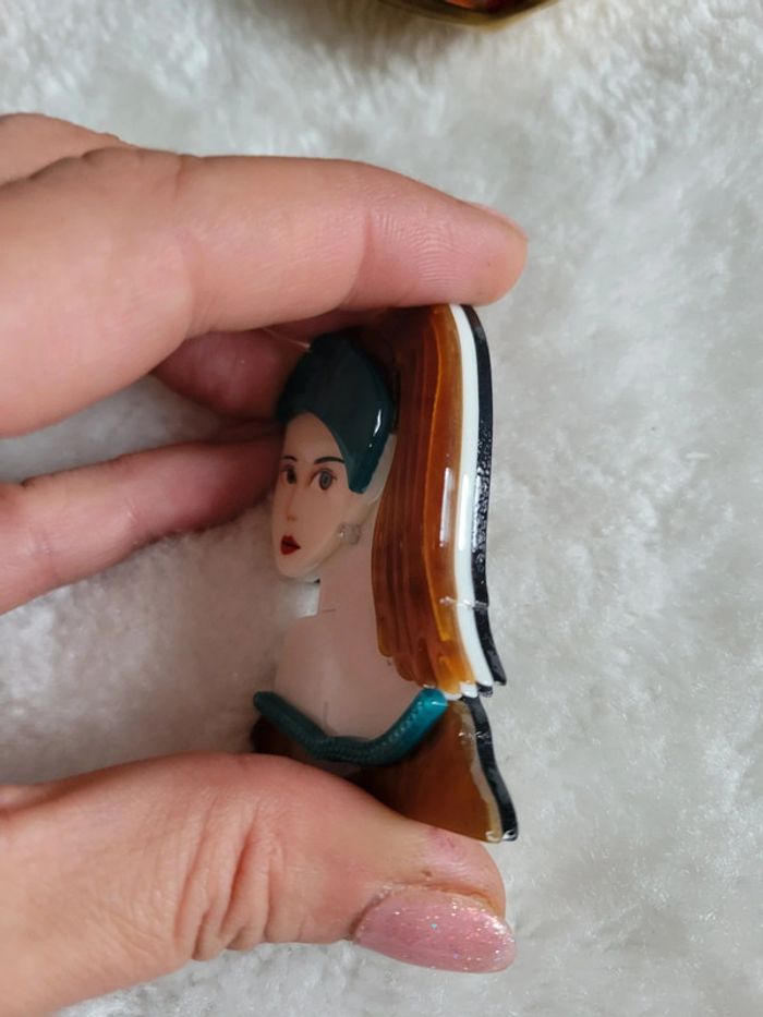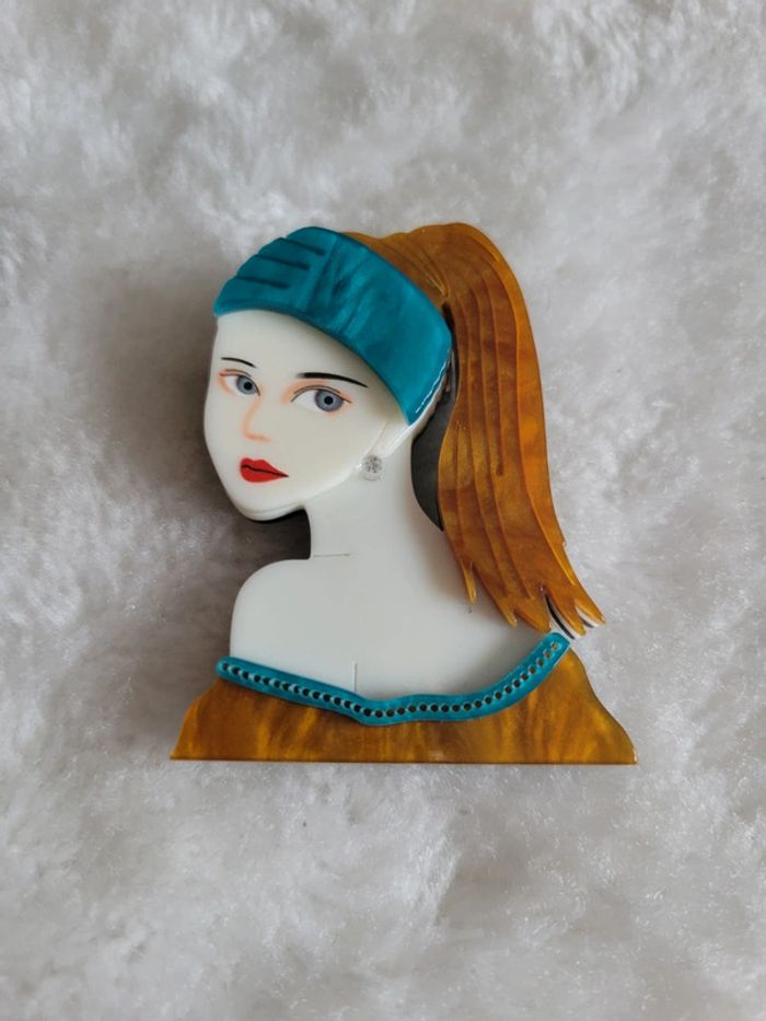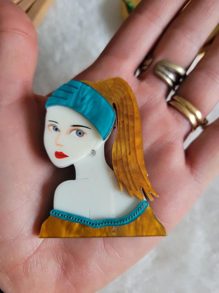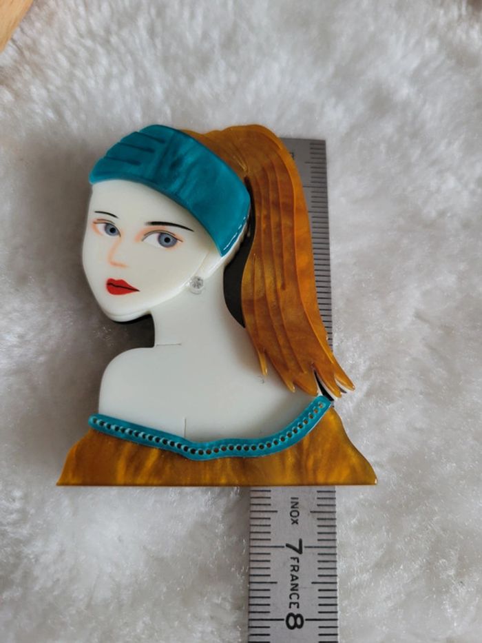 Magnifique broche acrylique Johannes Vermeer, peintre hollandais " la Joconde du nord" Originale Neuve Celle ci agrémentera joliment vos pulls, robes, chapeaux, sacs, vestes... Neuve, jamais portée. Differtents modèles dans mon dressing. Lot possible... Envoi sous 24h_48h Pochette 🎁 offertes sur demande...