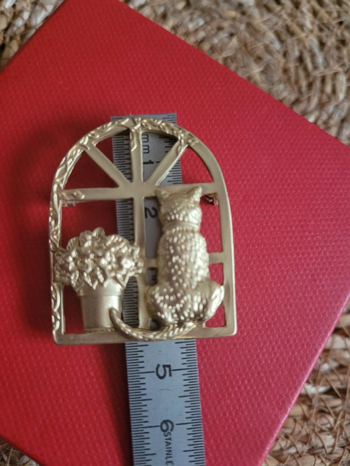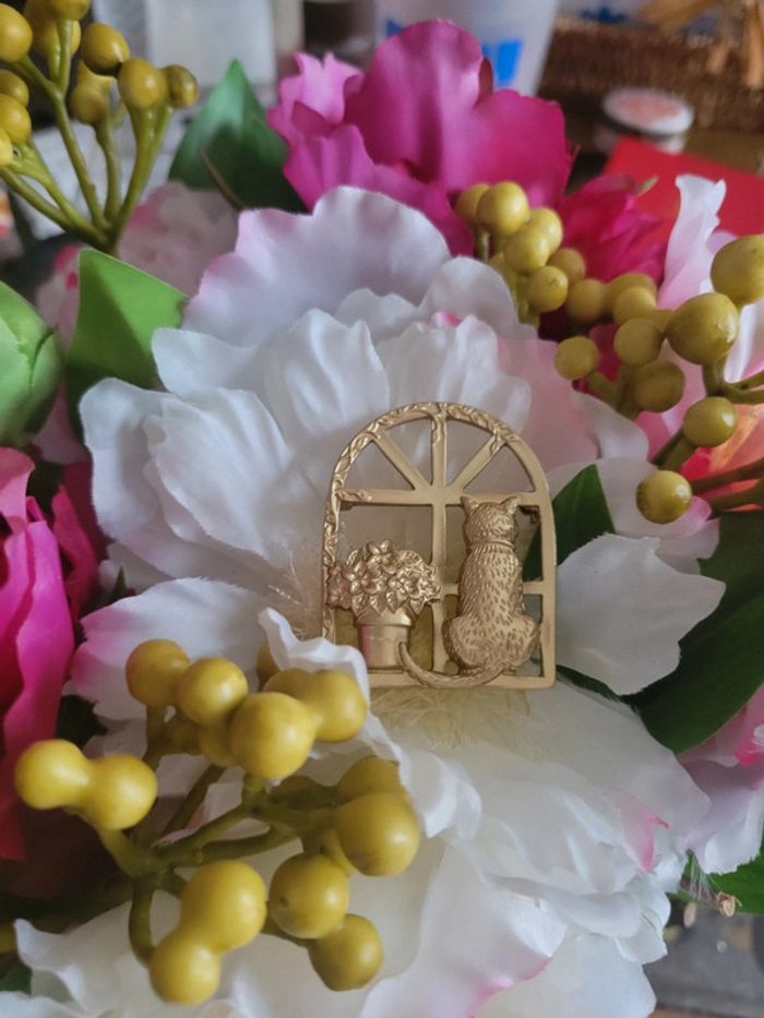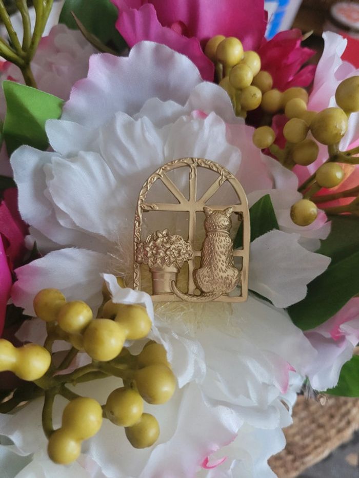 Broche chat 🐱 fleurs 🌸, à la fenêtre. Acier gold mat Neuve, jamais portée Différents modèles dans mon dressing....lot possible sur dde. Pochette 🎁 offertes sur demande...