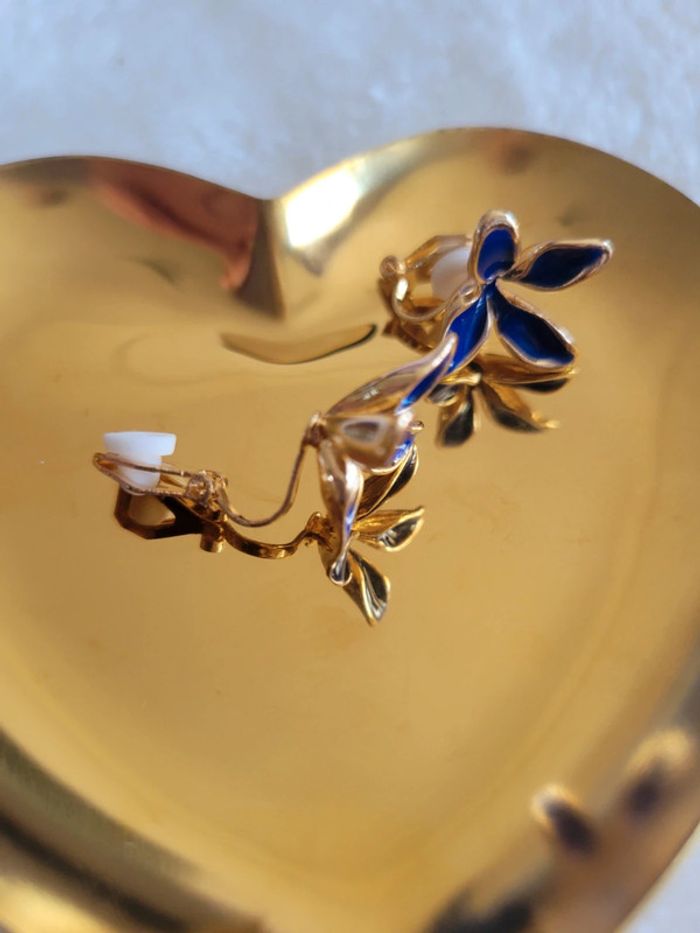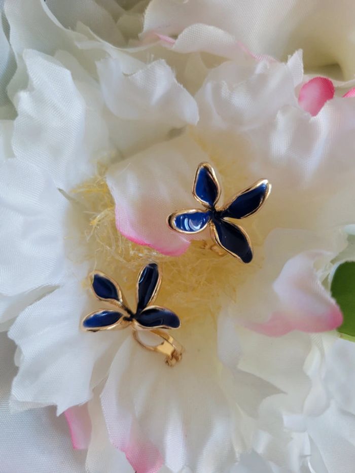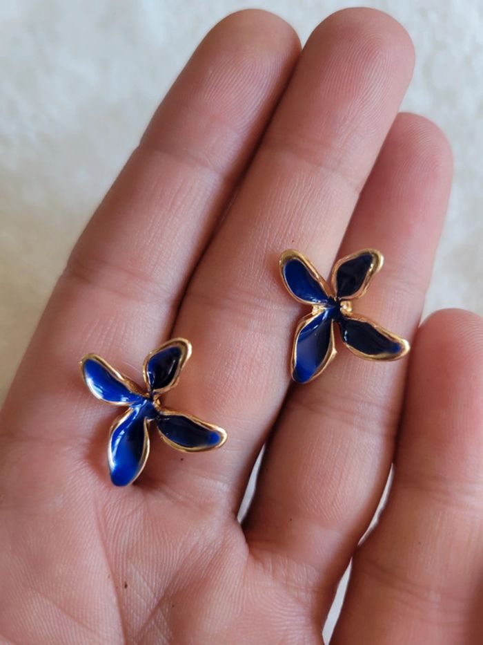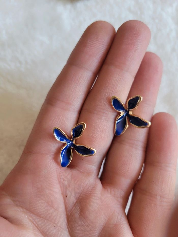 Clips fleurs 🌸 bleue Acier inoxydable gold, fleurs en email Hyppoallergeniques Neufs. Jamais portés # couleurs dispo (rose,bleu,blanc, violet) Lot possible avec différents articles de mon dressing,🥰👌🙂 Pochette 🎁 sur demande Envoi sous 24h_48h