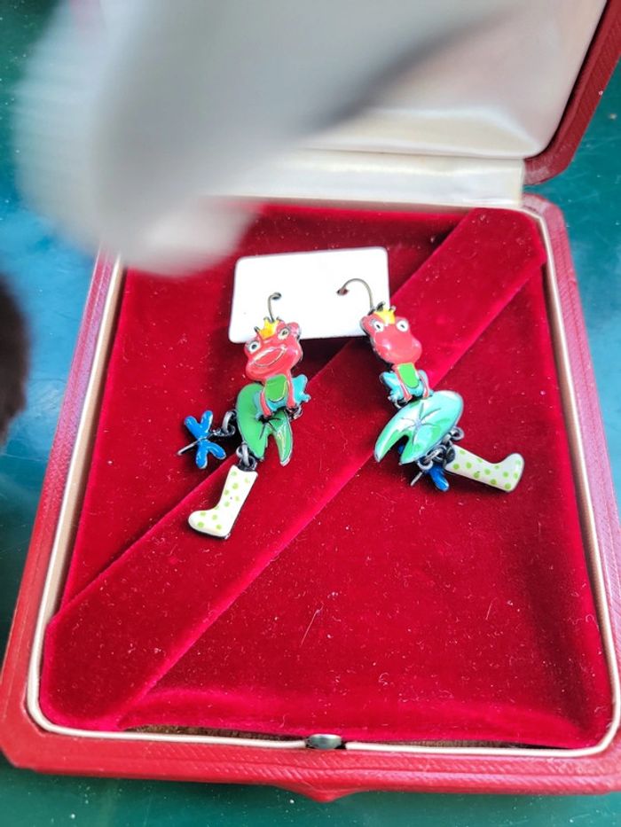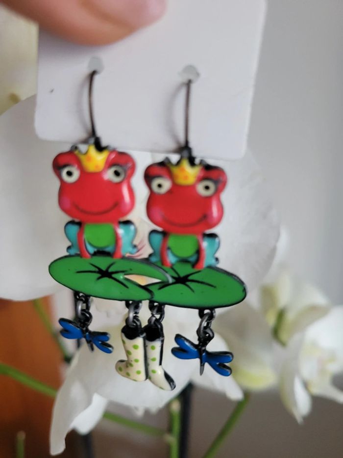 Originales. Humour. Oreilles percées Neuves. Grenouille " articulée" sur son nénuphar, bottes de pluie ☔️. Envoi rapide et soigné