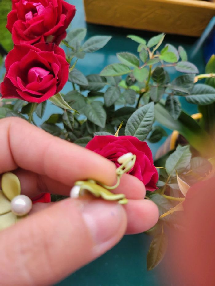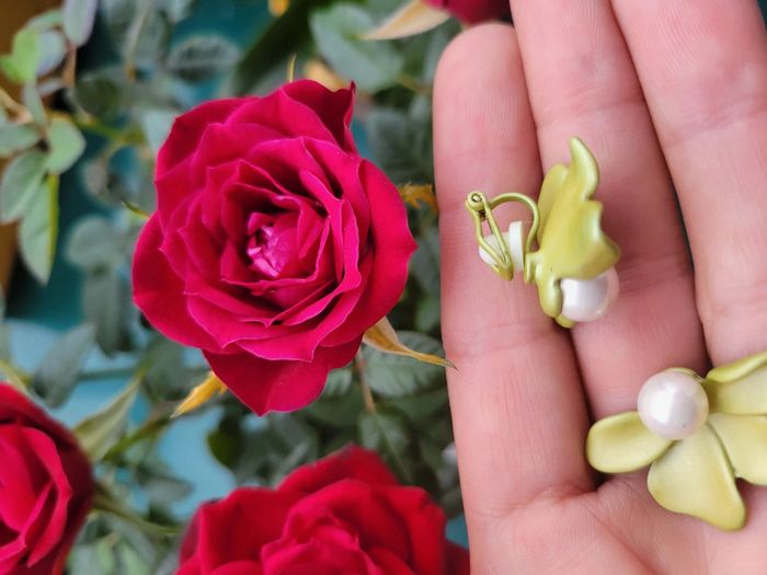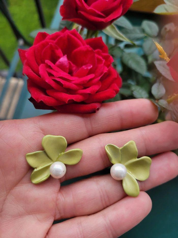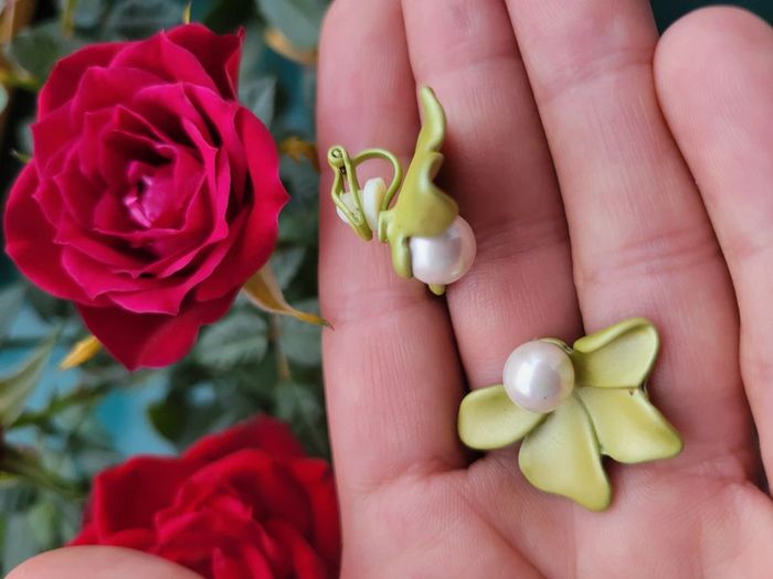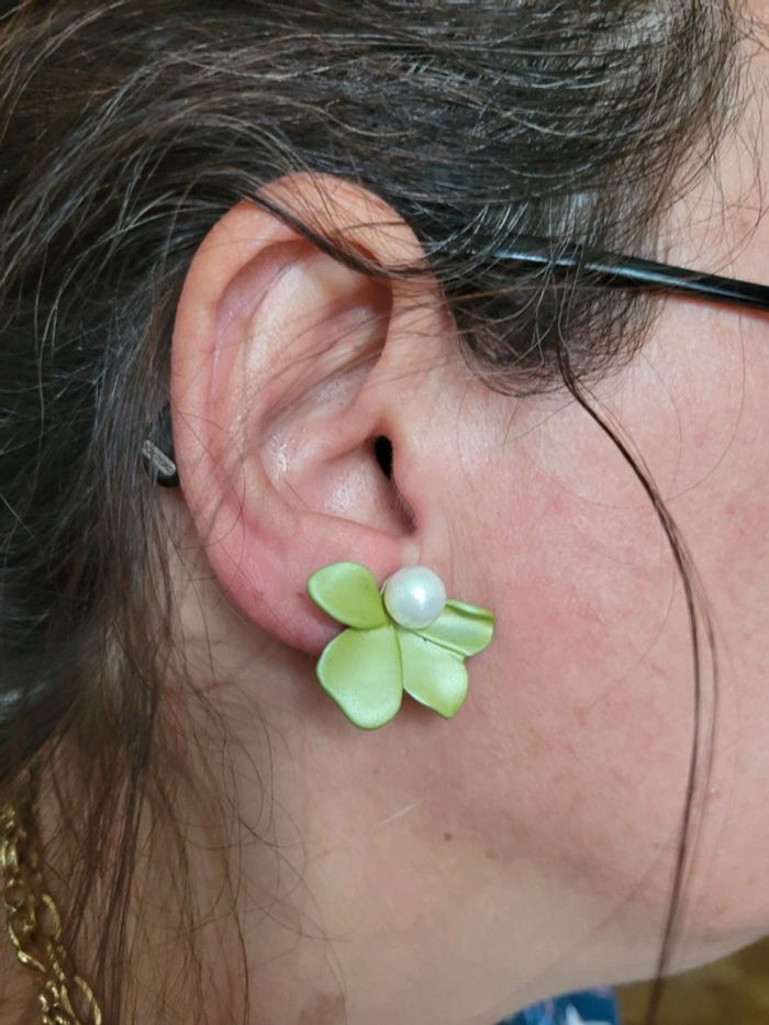 Clips asymetriques fleurs vert et perles blanches. Neufs, jamais portés. 2 poussoirs supp offerts. Pour oreilles oreilles 👂 non percées (Ou percees) Différents modèles dans mon dressing. Envoi rapide et soigné. Privilégiez Mondial relais (24h/48h) Pochette cadeau 🎁offerte sur demande..