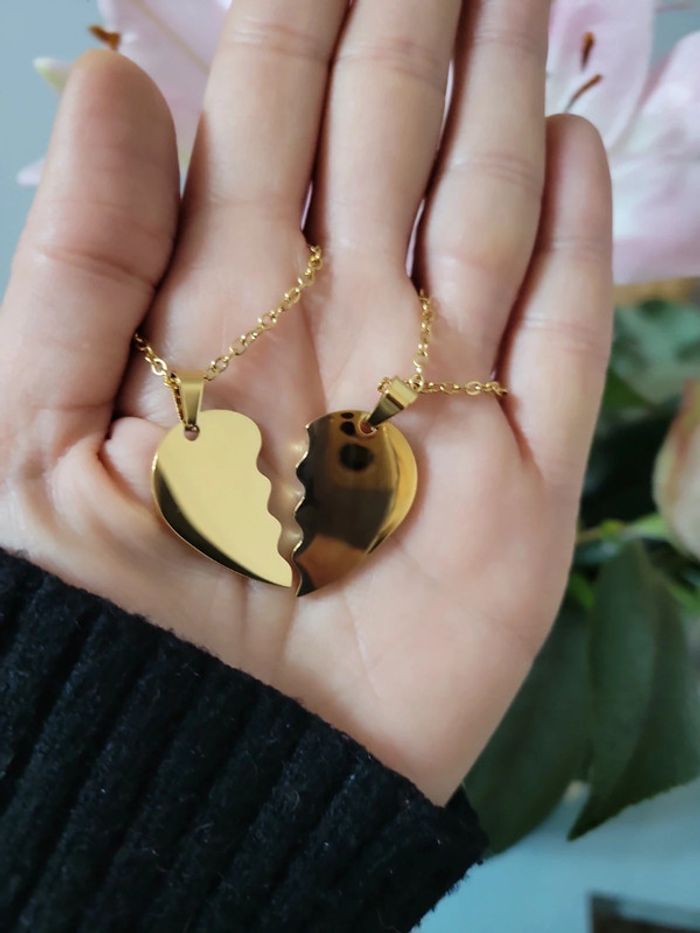 Magnifiques chaines cœur ❤️ à deux.. Chacun aura la moitié du cœur de l être aimé...🫶❤️ idéal St Valentin. Ensemble composé de deux chaînes (45cm) et deux "moitié du cœur" le tout en acier inoxydable gold. Hypoallergeniques. Neuves, avec étiquettes 🏷. Envoi rapide et soigné. Pochette cadeau 🎁 offerte sur dde. Le presentoir n est pas inclus il me sert pour les photos 📷)