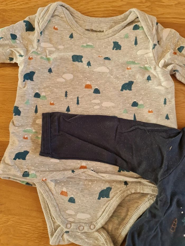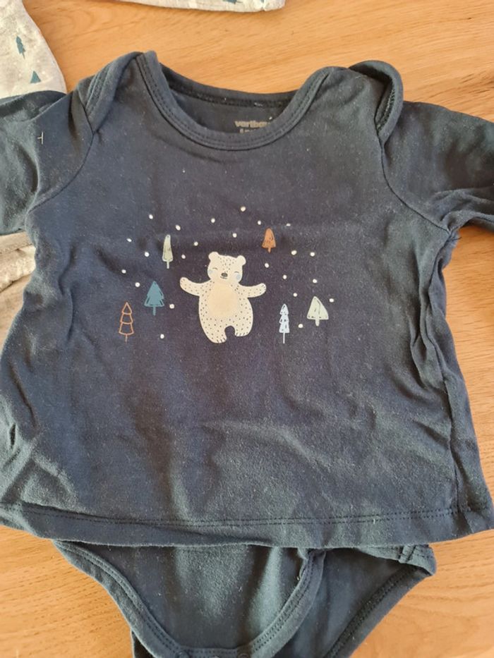 Bodies 2 en 1 vertbaudet, tee shirt manche longue qui fait body en même temps. En très bon état, taille 6 mois. Le body bleu n'est pas délavé, c'est la lumiere et l'appareil photo qui fait cette effet.