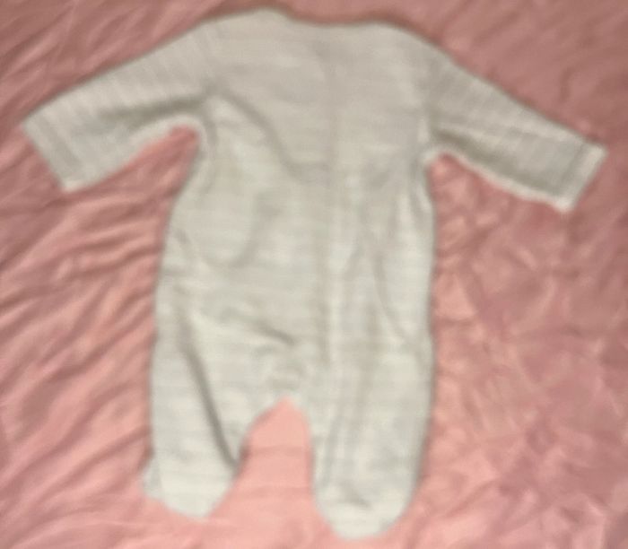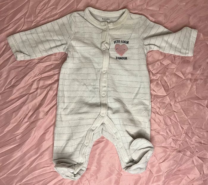 Pyjama rayé avec de fines lignes argentés " petit coeur d'amour". Fermeture sur le devant Marque: Kiabi Taille: 1 mois C.C